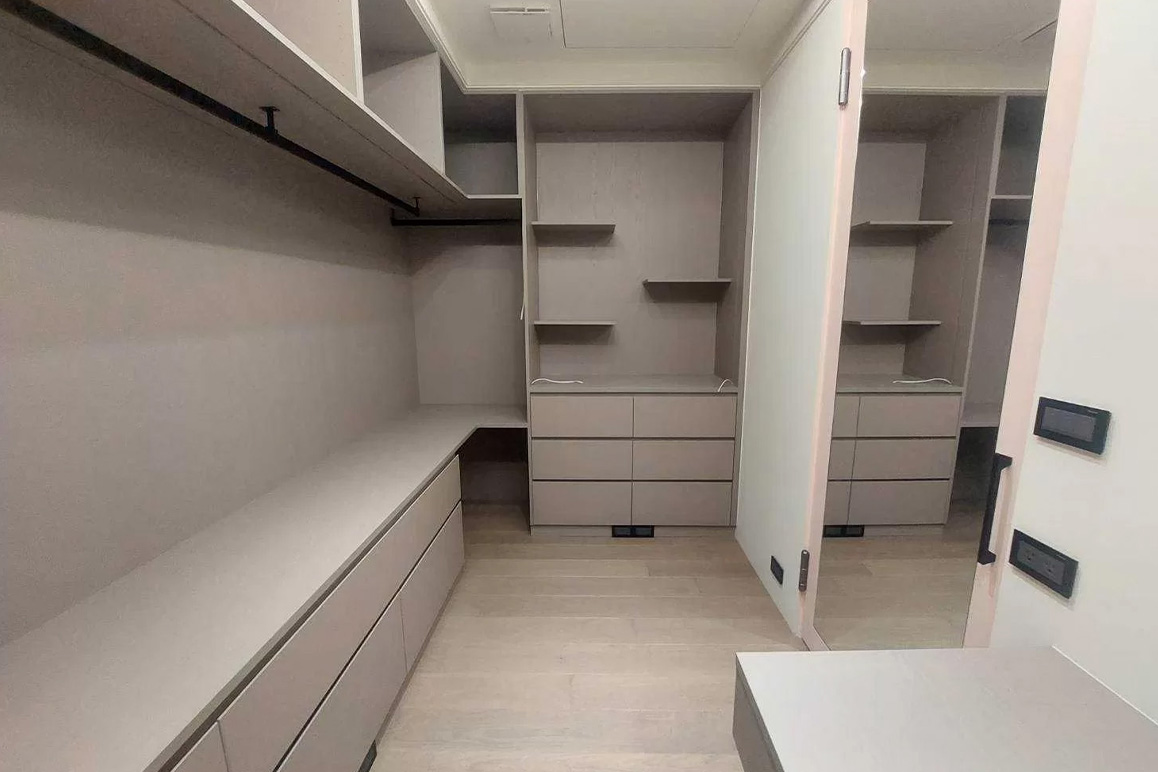現今居家坪數越來越小,為了提升坪效,也有不少人在裝潢時將更衣室融入空間動線,以下幾個設計重點為您說明:更衣室在臥房中,與浴室相鄰