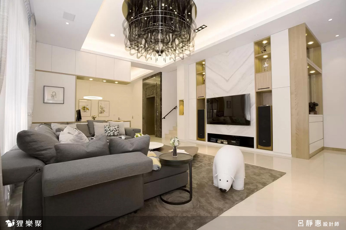 電視牆與電視櫃都是簡單的幾何設計,僅用材質的紋路締造出隱晦的差異,圓形茶几上的玻璃與金屬框自帶低調的奢華感,也與冰箱、大理石桌的光滑面呼應。此外,當面向客廳時,沙發後牆面的掛畫成為一幅景色,而坐在沙發上時,中島上的藝術吊燈在空間中也成為一個亮點,兩個焦點同時存在一個空間,而不交互影響。
