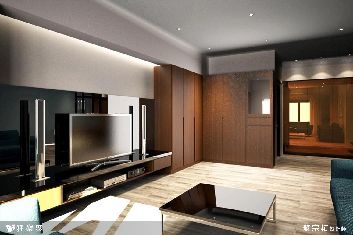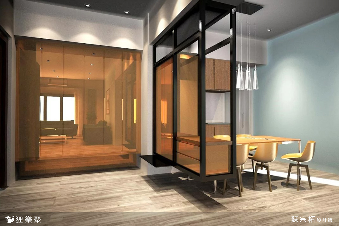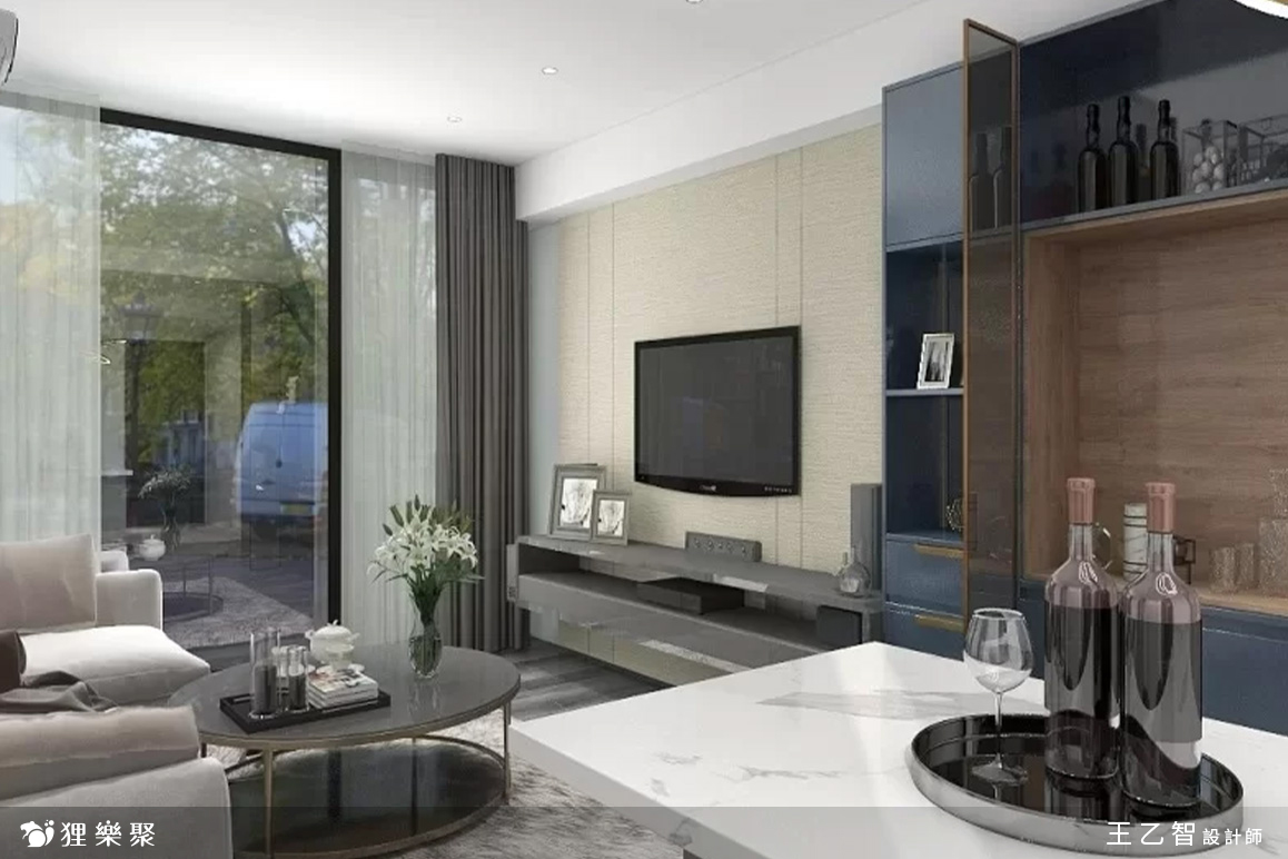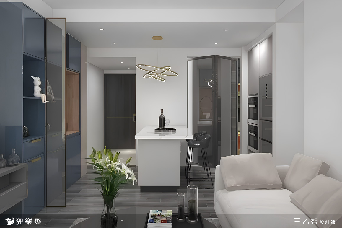這是一間三房兩廳的小宅,屋主希望在小坪數中也能展現低調的奢華感,因此設計師規劃裝修風格時以灰階為基礎配色,用木紋灰色地板增加空間的層次感,並搭配細節規劃,使空間在滿足生活需求的同時,也帶出輕奢風沉穩的大方氣派。經過玄關櫃淺灰的門片後,會見到石紋檯面的中島,客廳系統櫃中有一片小小的灰玻屏風,區分了客、餐廳,也解決了開門見窗的風水疑慮,系統櫃黛藍色的門片帶出了變化,也展現出區域轉換的自然過度。