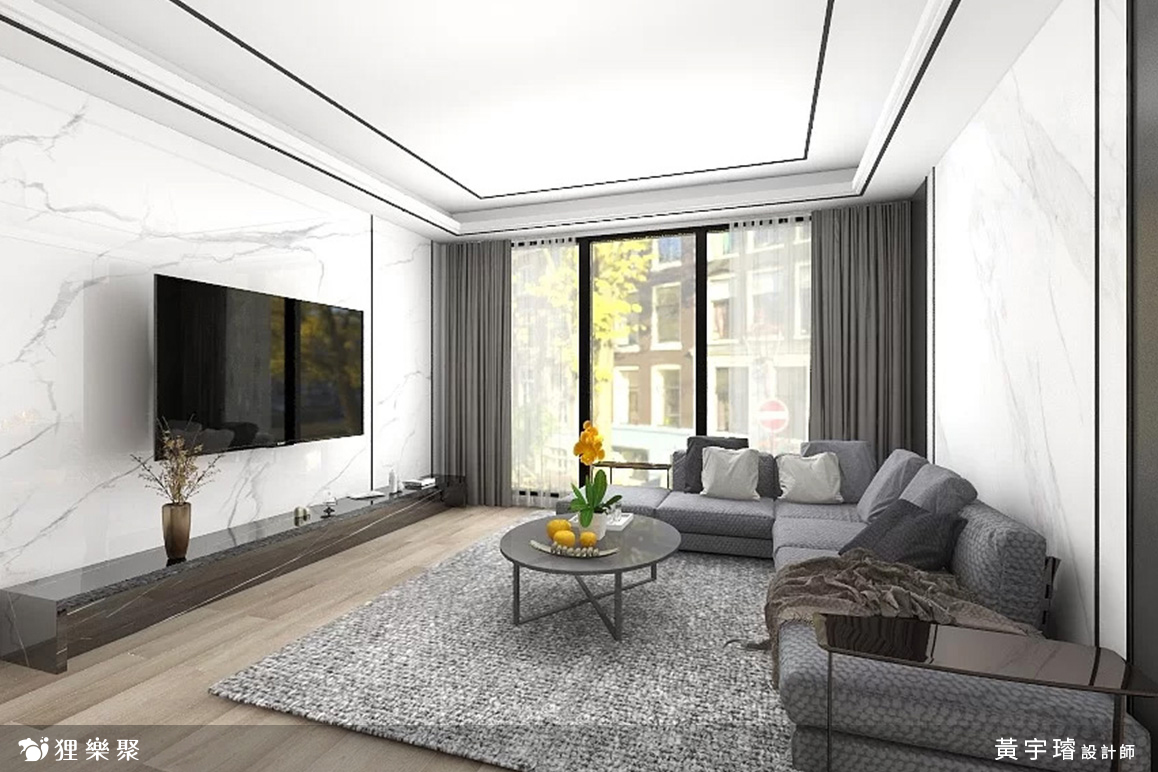 這是一間三房兩廳25坪的設計案,屋主希望家裡能裝潢成兼具溫暖與優雅質感的輕奢風格,主要讓設計師規劃的是客廳與餐廳、廚房。設計師擷取現代風簡潔俐落的工法,搭配黑白灰、石材、金屬,來彰顯簡約又充滿細節的輕奢風韻味。打開大門迎接家人的是溫暖的木色,木地板與木格柵溫柔的質感,加上客廳柔軟的地毯、織物,寬敞落地窗外灑入的陽光,給人一種雅致的舒適感。潔白電視牆上的大理石紋,為空間增添了層次,加上天花板上方型的鍍鈦飾條,劃分出空間的同時,更帶出屋主對細節的講究。