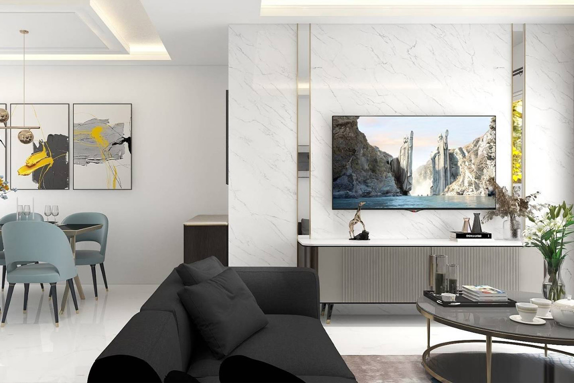 ▲ 大理石電視牆與亮面地板,整體以白色系為主