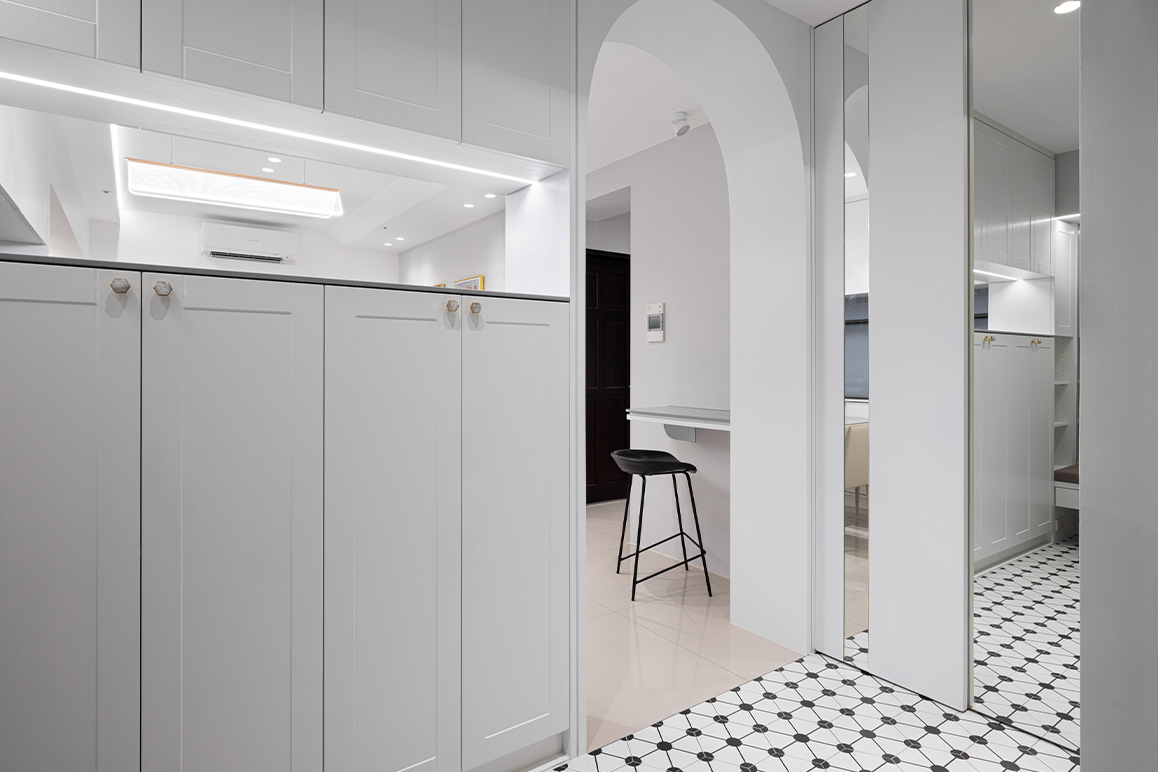 美式風格的線板相較於古典風更顯簡約俐落,不論是玄關、廚房、臥室、沙發背牆等各區域都能發現其蹤跡,連續性的使用線板裝飾能達成視覺延伸的效果,放大整體空間,也能透過使用相同款式、顏色的線板為空間帶來一致性。線條簡潔的傢俱與裝飾