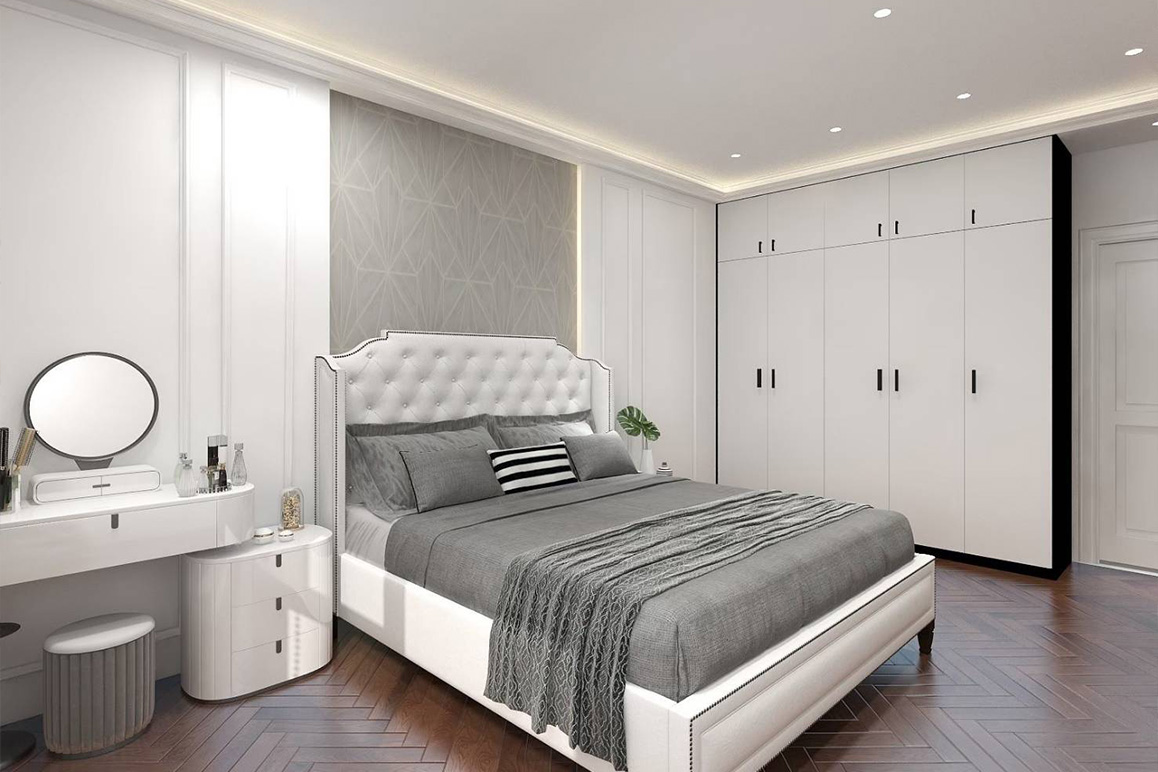 設計師透過白色的大理石電視牆,圍塑出輕奢調性,搭配亮面的地板、茶几與餐桌帶出開闊且具現代感的美式風公領域細節;主臥室則以線板床頭背牆搭配人字拼木地板、窗邊特色單椅,創造舒適且助眠美式空間氛圍。>>點擊看完整案例介紹