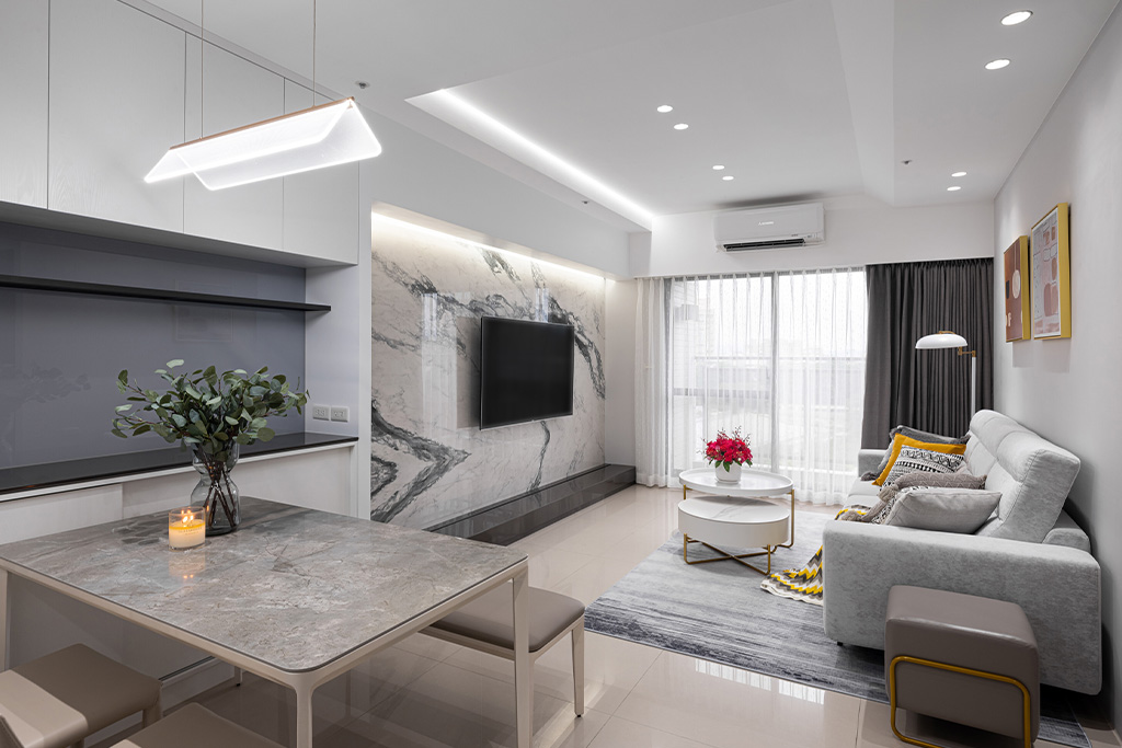 由黑灰白構築的裝潢配色,巧妙的烘托了石材、玻璃與燈具的美好,恰到好處的平衡,使細節融入空間,於其中生活,那麼生活也將成為家中的一項精品。