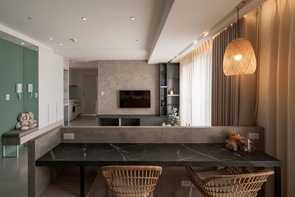 這是一間現代風的新成屋,屋主希望能夠有個簡約時尚的空間,能乘載下班後的疲憊,因此室內設計師以黑灰白色系為居家配色的基礎,打造出如藝廊般純粹靜謐的公領域設計。客廳以白色為主色調,黑灰為輔色,構築出壁壘分明的裝潢色調,其色彩界線構築出俐落的風範,佐以黑色鐵件框著瀑布玻璃的隔屏、灰色石材的電視牆、吧臺上方的設計燈具,讓客廳宛如展區,從不同角度看去,皆能觀賞到不同的展品的風貌。