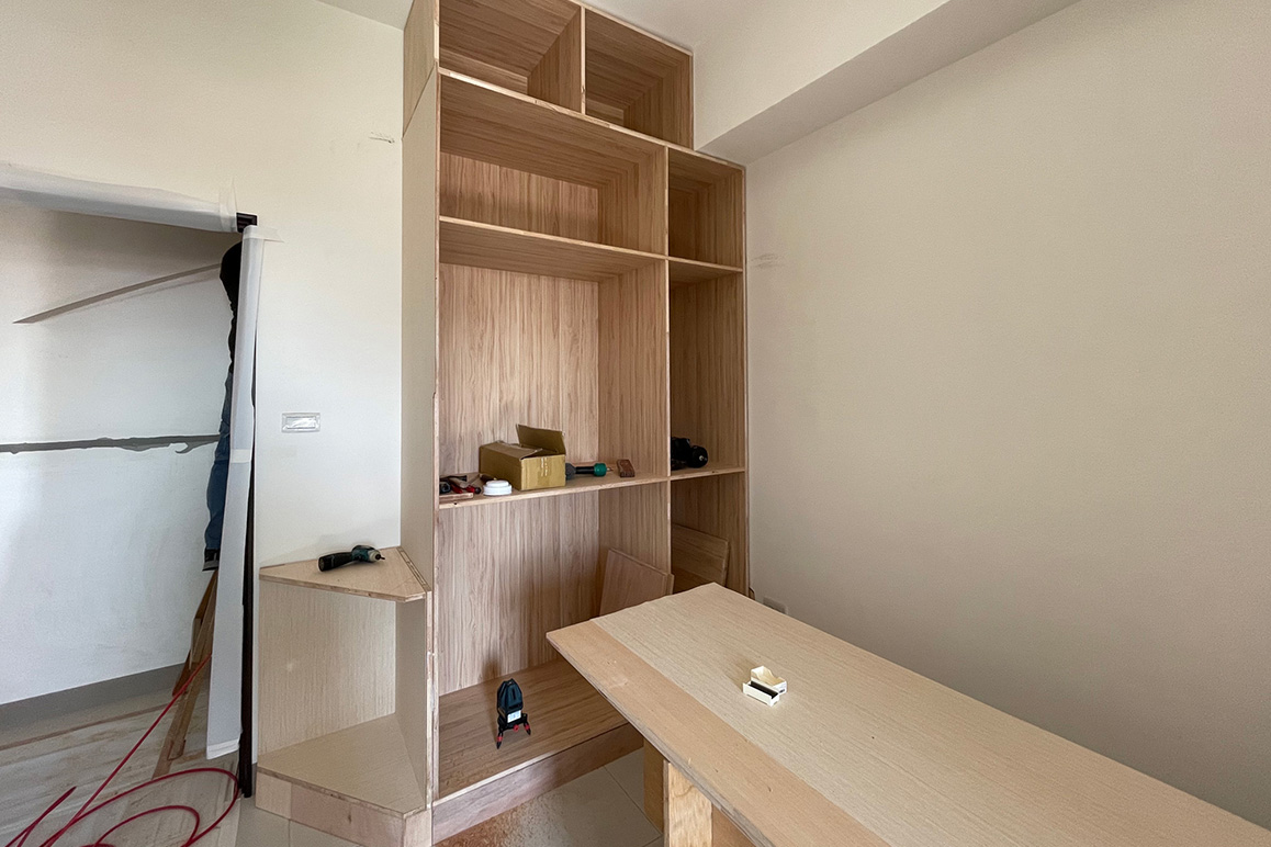 系統櫃顧名思義是將櫃體、家具以模組化的形式生產,依照空間需求把所挑選的系統板材與五金配件搭配組合,便成了不同功能的組合櫃體。設計師於現場丈量尺寸後,會依尺寸繪製系統櫃設計圖、開始拆料計算,如:確認固格位置,並依狀況補充背拉桿以確保櫃身支撐,預先在工廠製作、裁切後再送至現場組裝。
