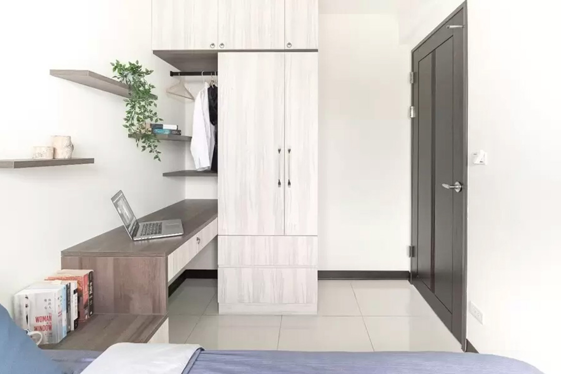▲ 臥室局部開放系統櫃,牆上做置物架