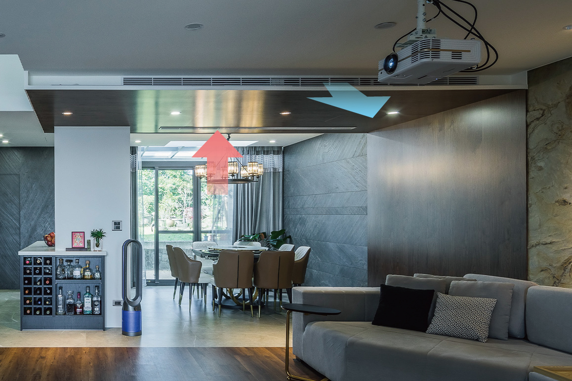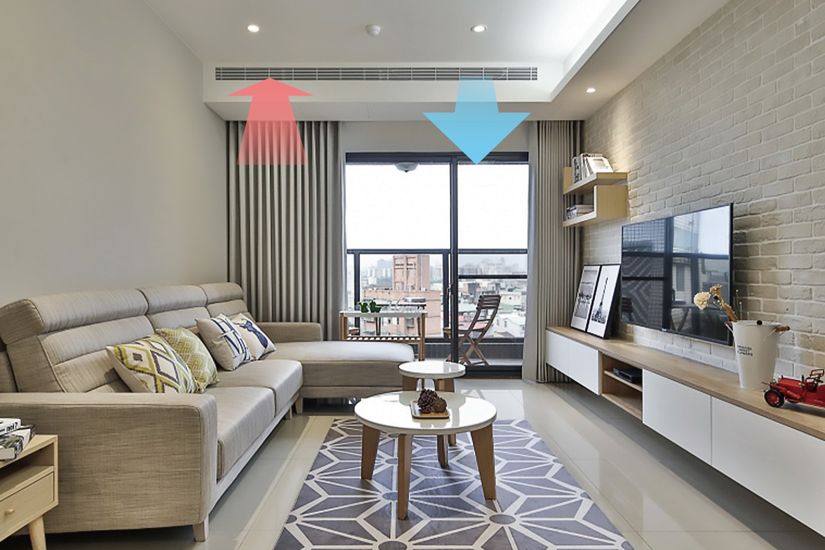 吊隱式冷氣又稱為隱藏式、懸吊式冷氣,室內機藏於天花板,透過風管分配至出風口,因此冷房能力會比壁掛式的差,所以挑選冷氣噸數時需要特別注意,冷房能力是否充足。另外,可以透過出風口的規劃加強冷房能力,吊隱式冷氣的出風口有側出側回、側出下回、下出下回三種,其中側出下回的出風與回風的氣流不會交叉影響,因此對流效果最佳,其次為下出下回,最差為側出側回,所以後兩者在設計時有一些細節應注意,以免讓冷房效果更差。