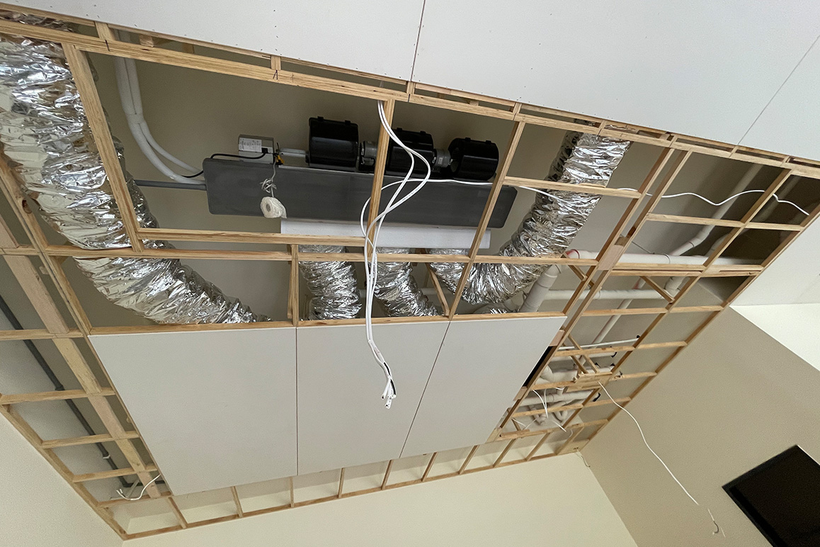 吊隱式冷氣安裝過程則是在裝潢木作進場前,要先預留好維修孔的位置、配好排水管路、冷媒銅管還有風管,並將室內、外機一併安裝完畢,接著要等到油漆完畢後,再將出、回風口的ABS板裝好,倘若要在油漆前就安裝出、回風口,裝完要請冷氣師傅另外做保護,以免ABS板被油漆沾染。