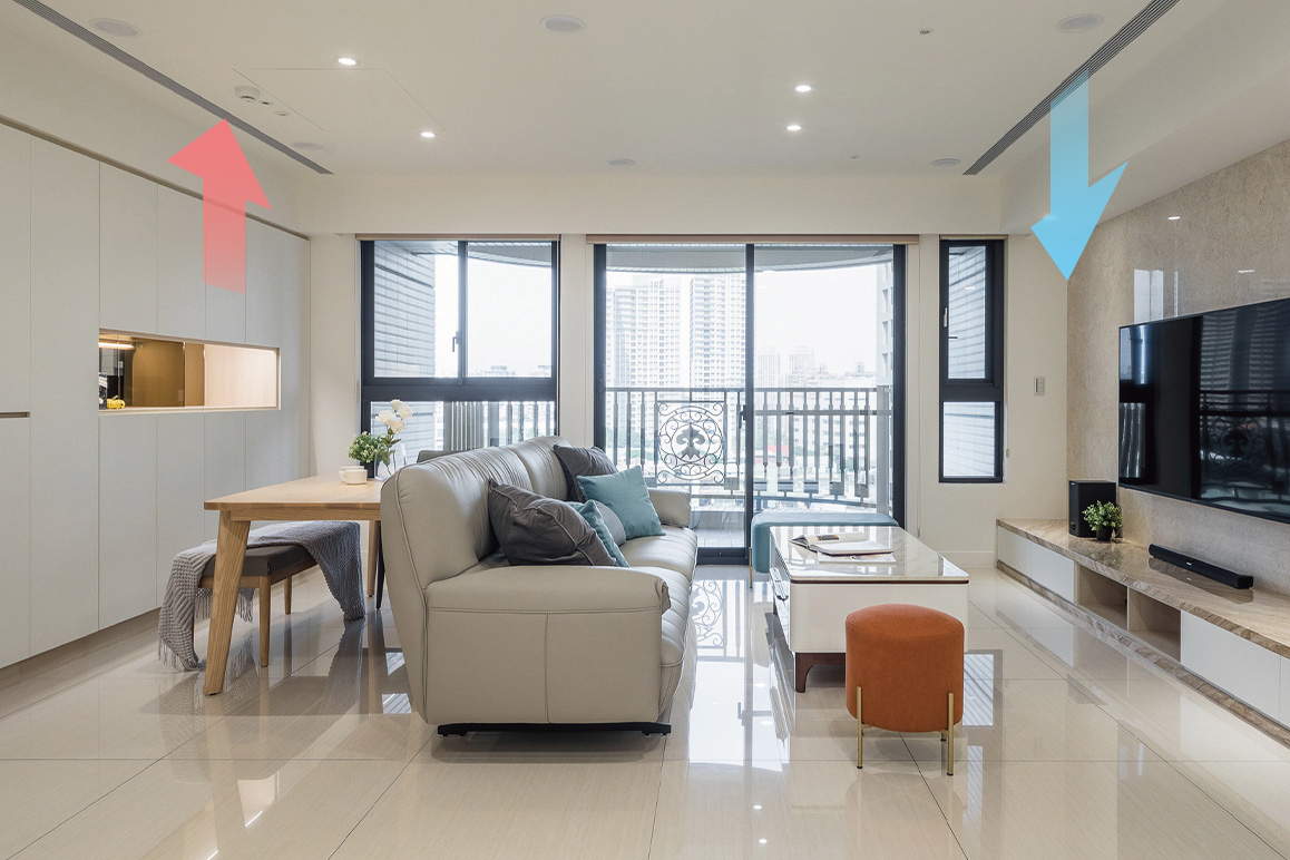 做側出側回的裝修設計時,出風口與回風口不應該相對,以免冷氣吹出就被吸回,降低冷房能力;下出下回因為出風口直接對著地面,循環較短,應注意出風口與回風口不要對到櫃體,以免再降低冷房效率。最後,無論是哪種方式,冷氣出風口與回風口的位置盡量遠離,如此冷房循環能力才能發揮完善。