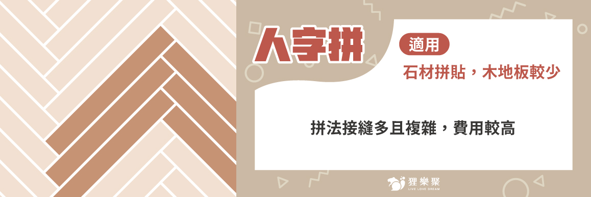 人字拼的英文為Herring Bone,顧名思義為紋路像「人」字的拼法,常見於歐風裝修中,能打造出濃厚的復古、美式氛圍,人字拼適合實木地板、海島型地板或磁磚等窄長型地材,但因此拼法的接縫多且拼法複雜,較不適用於膨脹率高的地板材質,人字拼的耗損率約10%左右,且費用相較於其他拼法高。