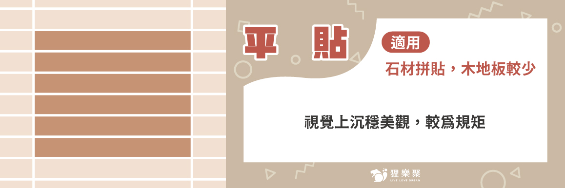 將板材以上下對齊的方式規則排列,和其他拼法相較之下較為規矩,視覺上看起來沉穩美觀,較常見於石材拼貼,木地板反而較少。可以搭配不同花紋圖案的地坪營造室內設計的豐富性,創造多變的視覺感受。