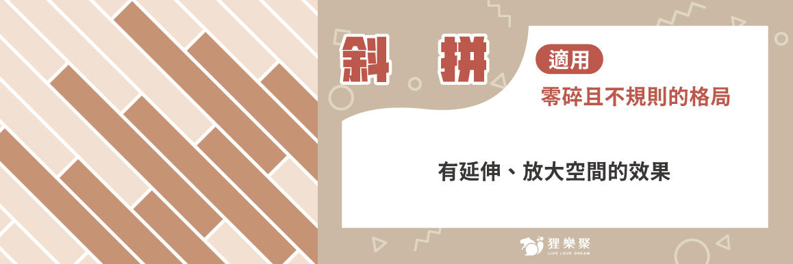 鋪設時通常會以45度斜對角作為基準線,適合裝潢於格局零碎且不規則的空間,能改善整體視覺感,並透過材質的選用創造出延伸、放大空間的效果,耗損約落在10%~20%之間,若想做特殊角度斜拼地板費用也會較高。