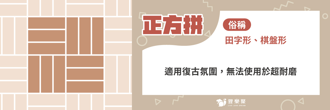又稱為田字形、棋盤形,是利用3~5塊長方條去組合成一個正方形,也有在工廠加工組好,再運送至現場裝潢施工的做法,尺寸有45cm、50cm 、60cm、65cm等尺寸,能營造出老房子的復古氛圍,但無法使用於超耐磨木地板,且施作價格較高。