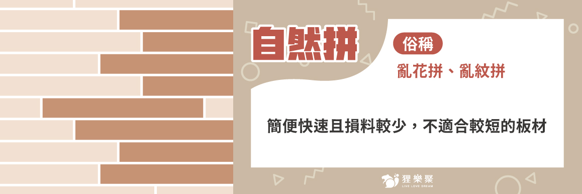 也稱作亂花拼、亂紋拼,通常會先將第一排地板拼完後,以剩下的材料直接接續鋪第二排,呈現出不規律的拼接方式,整體效果較為自然,裝潢施工起來也簡便快速許多且損料較少,但不適合較短的板材。