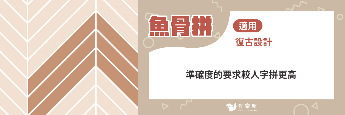 魚骨拼的英文為Chevron,與人字拼的工法雷同,但魚骨拼並不像人字拼會長邊、短邊相互交叉,而是將頭尾都切斜邊後再拼貼在地板上,準確度的要求相較於人字拼更高,可塑造出復古且高雅的室內設計氛圍。