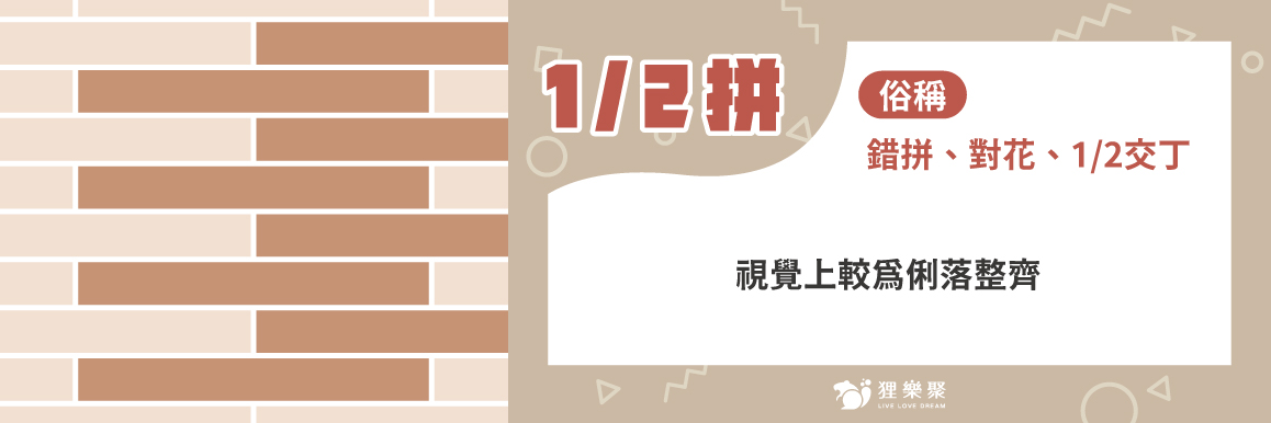 也稱錯拼、對花、1/2交丁。拼貼時會將地板交接處與前一排的1/2處對齊並依序排列,視覺上較為俐落整齊,耗損約6~8%,不論是木地板、石材或磁磚等各種紋路都很適合,是目前居家裝潢常見的地板鋪設方法。
