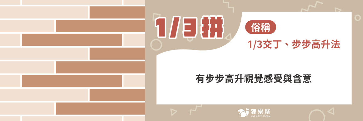 又稱為1/3交丁、步步高升法,是將地板接縫對齊於在前排的1/3處與2/3處,每三排為一個循環,施作完成有如階梯步步向上的視覺感受,也帶有「步步高升」的含意,和1/2拼一樣是台灣居家中常見的裝修方法。
