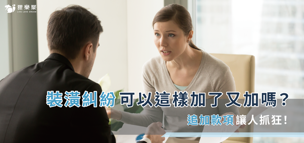 房子做裝潢時,最讓人頭痛的就是不斷增加的追加款項,這也時常造成室內設計公司與屋主之間的不信任,引發一連串的裝修糾紛。一加再加的追加費用,也使原本預計帶來幸福感的裝潢,成為屋主的夢魘,即使完工也揮不散心理陰影。