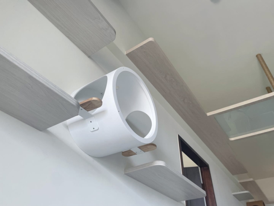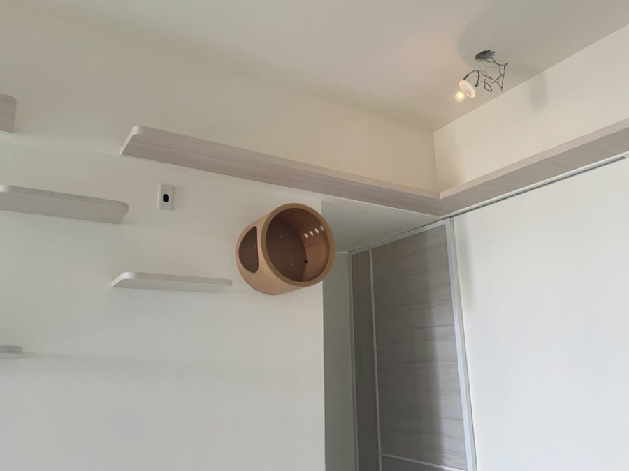 貓主子喜歡跳上跳下、從高處巡視、觀察奴才們,因此規劃貓咪寵物宅時更該注意垂直空間的配置,可以利用錯落的層板設計製造出讓貓咪活動的垂直空間,在規劃時也要注意避免銳利的邊角造型,或是以護角套保護,以免毛小孩行經時受傷。另外門窗也必須做好防護,避免使用下壓式把手,以防貓咪輕易開啟,窗戶外也記得要配置安全防護網,或是加裝隱形鐵窗,才能打造安全又好住的貓咪寵物宅。天空貓道