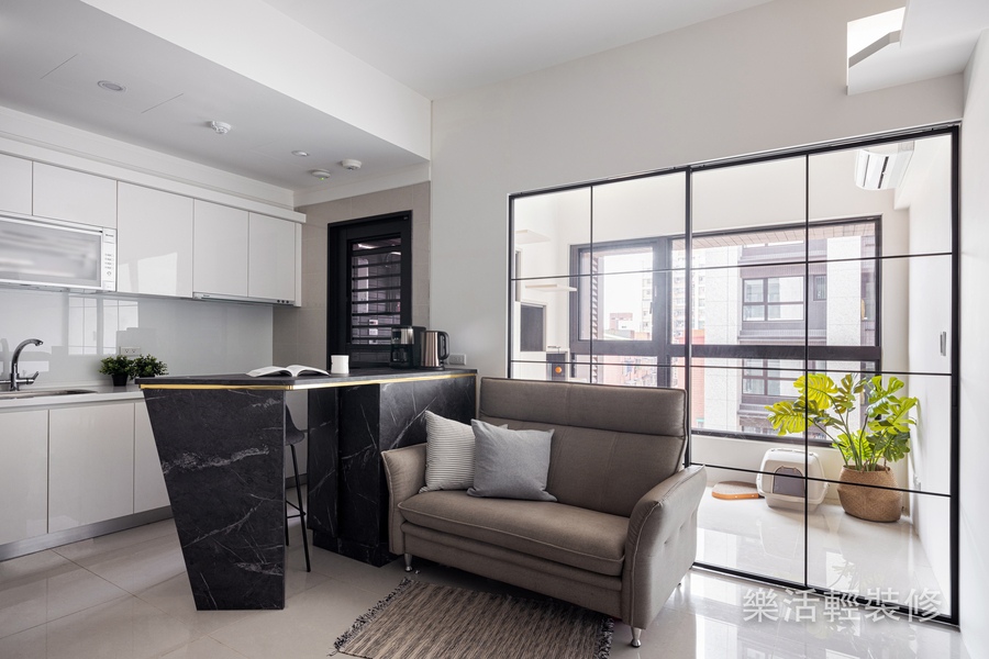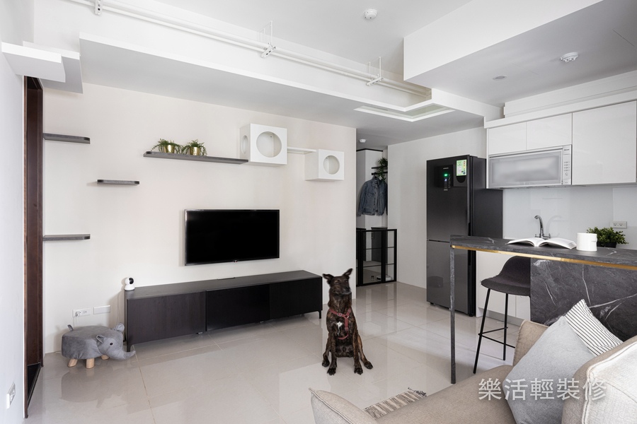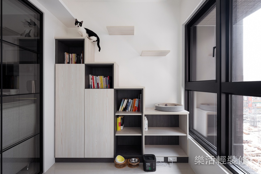 10坪的小宅除了屋主的生活機能外,還要規劃2貓2狗的的生活空間,有可能嗎?設計師辦到了!為了讓毛小孩能自在生活,設計師以系統櫃體配置出向上的階梯空間,並結合玻璃、層板等材質,在高處打造了貓咪步道,讓貓主子能從高空觀察奴才們。風格上以簡約的線條、黑白色調搭配石材與金邊元素呈現,並保留公領域的原始天花營高度,以玻璃拉門區隔空間,使整體通透又保有彈性,構築出高機能的開闊寵物宅。>>點擊看完整案例介紹