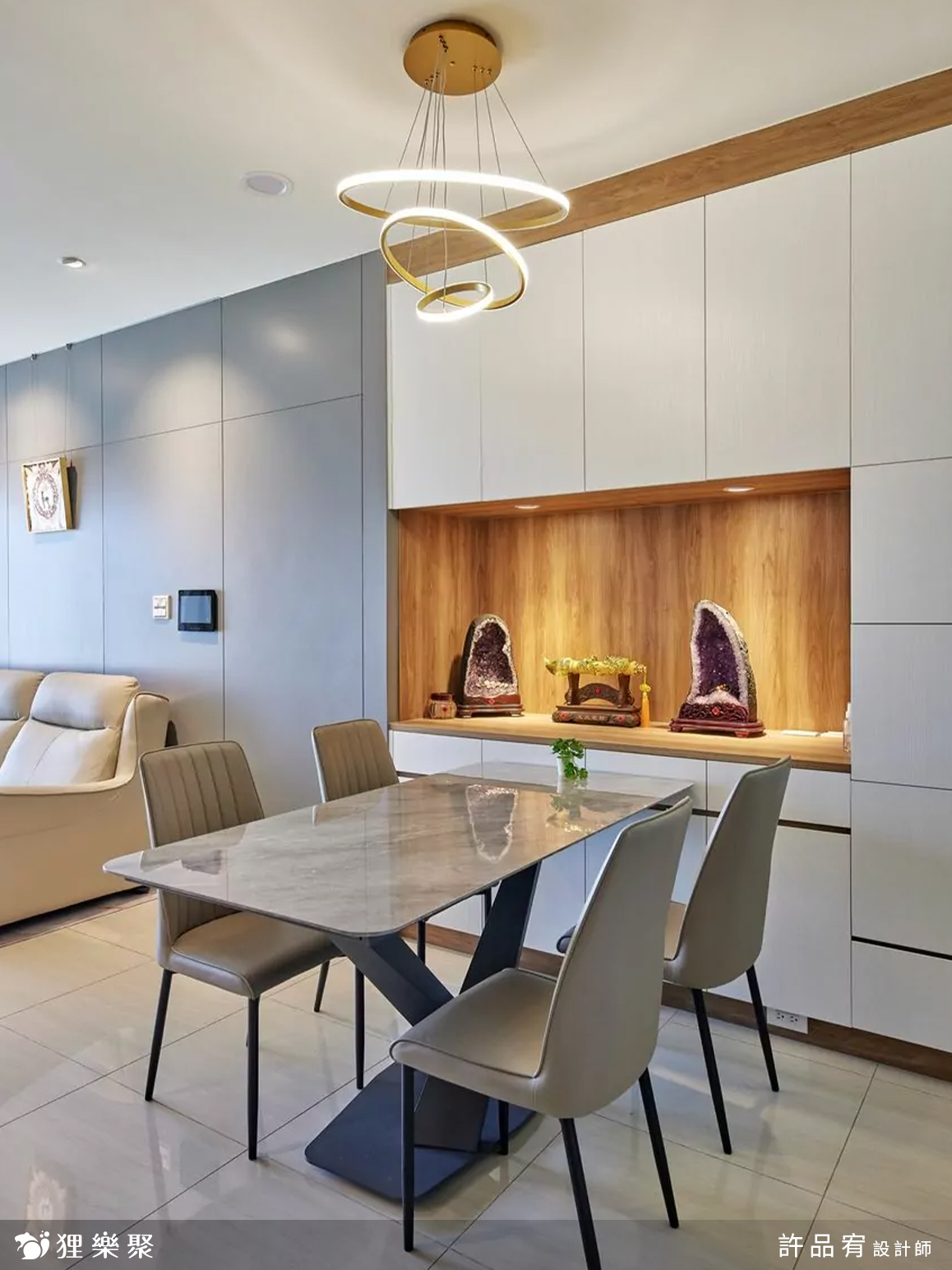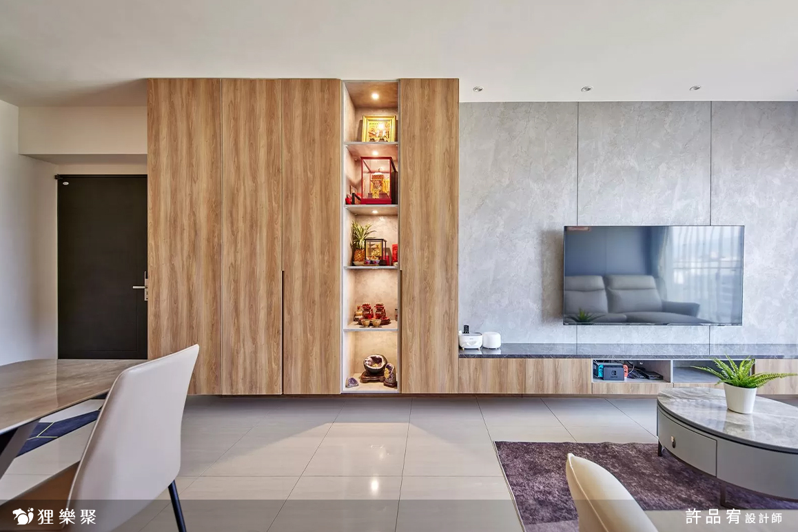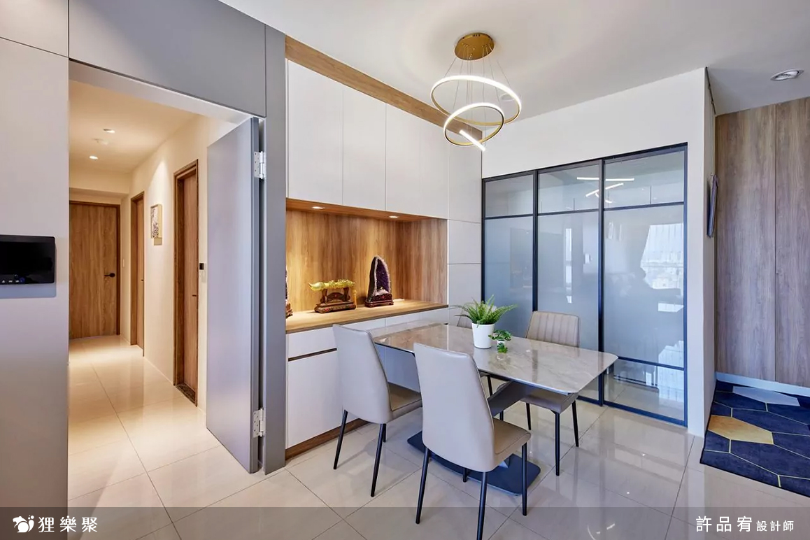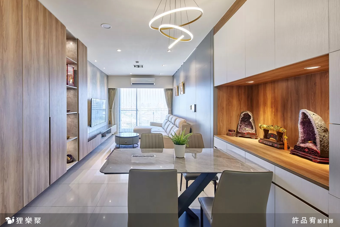 這個現代風設計並非以經典的黑白灰三色打底,而是融入古典的氛圍,以白色和偏深的木質調做為底色,讓空間的色彩呈現偏暖,更加符合業主對於家的想樣;除此之外,設計師用俐落的線條來展現出大氣的現代風設計,除了線條平直的櫃子設計外,在空間線條的分割上,藉由「均分」的手法可以讓空間產生無限延伸且放大的效果,無論是在櫃體的比例、廚房的隔間拉門或者是壁面的設計上,都能看到這樣的手法。