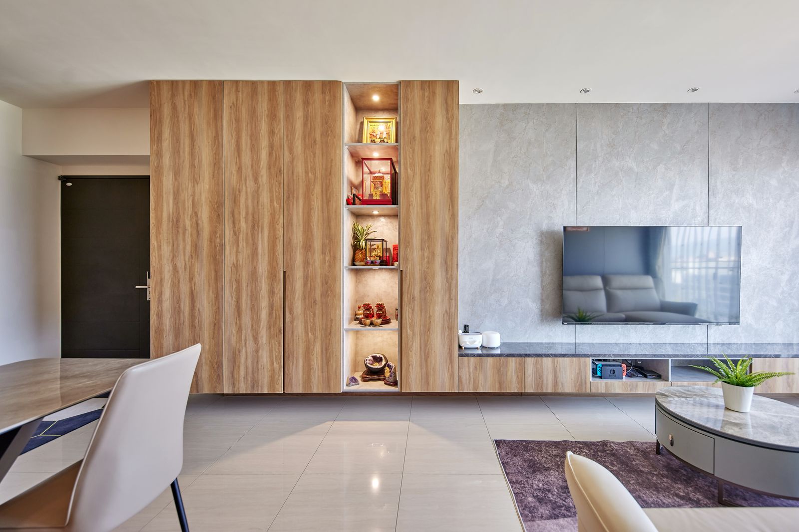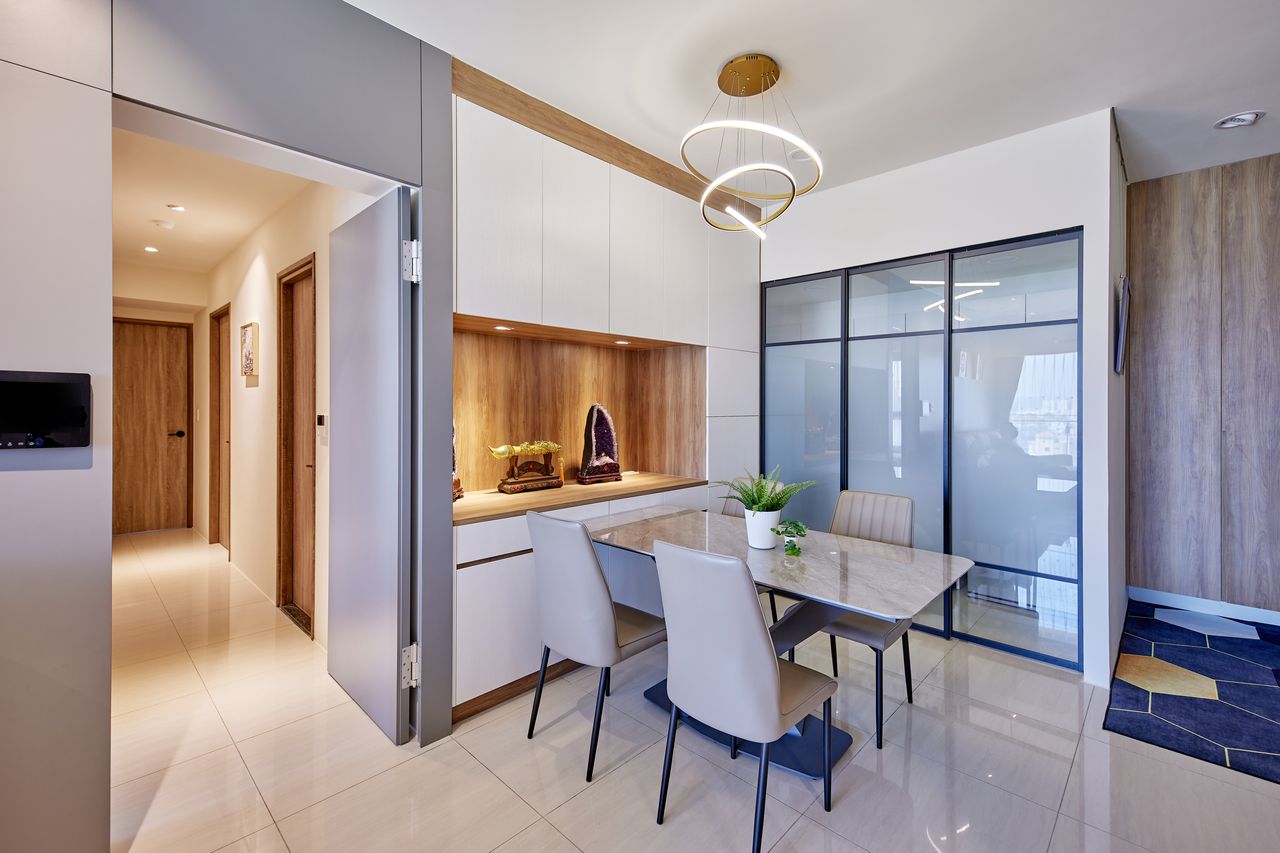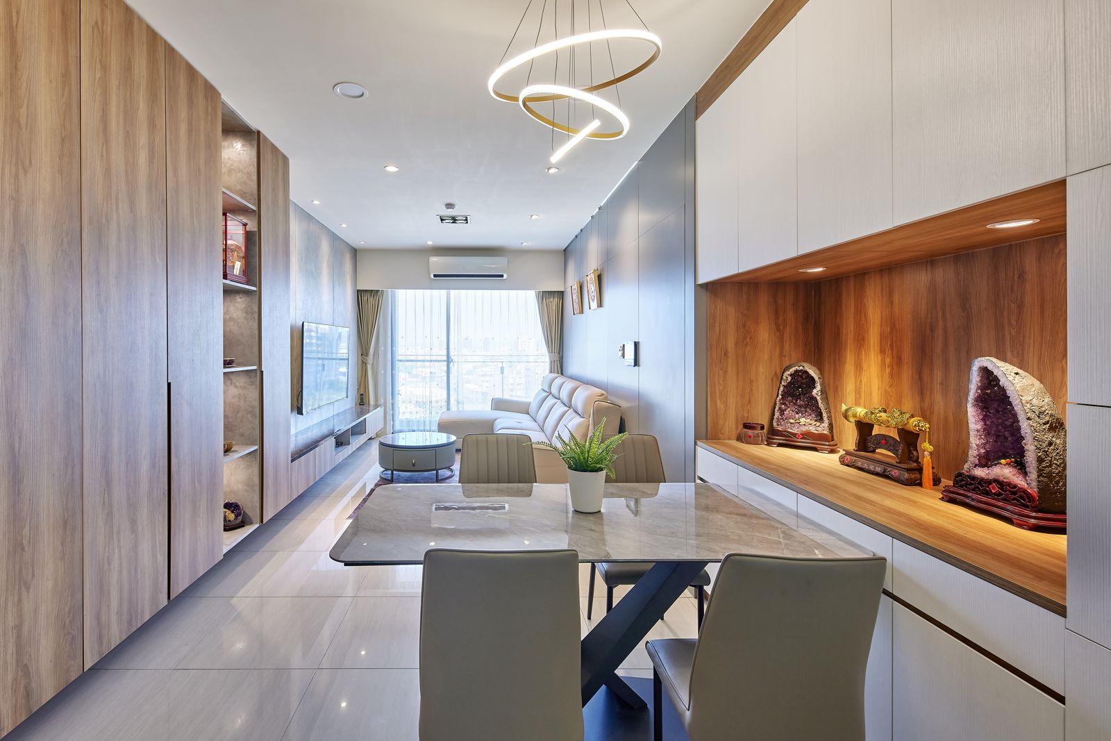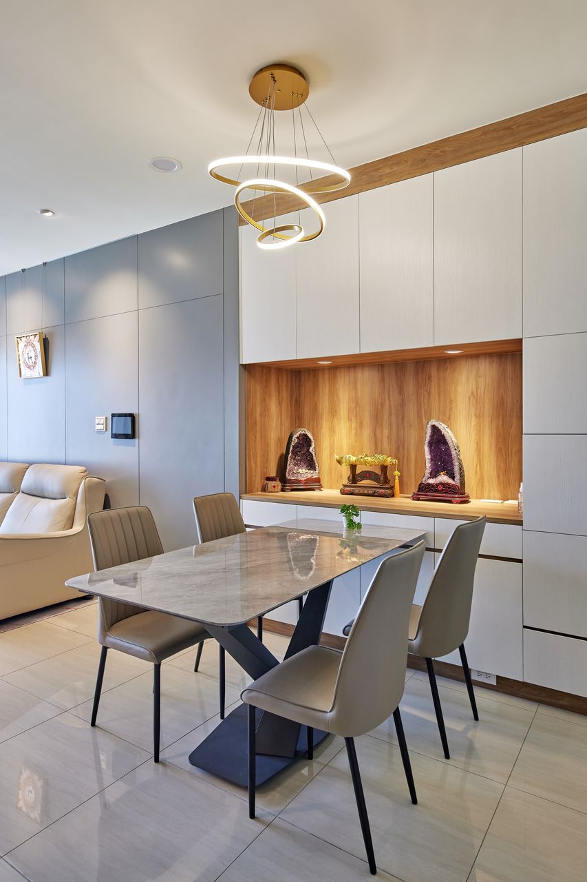 這個現代風設計並非以經典的黑白灰三色打底,而是融入古典的氛圍,以白色和偏深的木質調做為底色,讓空間的色彩呈現偏暖,更加符合業主對於家的想樣;除此之外,設計師用俐落的線條來展現出大氣的現代風設計,除了線條平直的櫃子設計外,在空間線條的分割上,藉由「均分」的手法可以讓空間產生無限延伸且放大的效果,無論是在櫃體的比例、廚房的隔間拉門或者是壁面的設計上,都能看到這樣的手法。