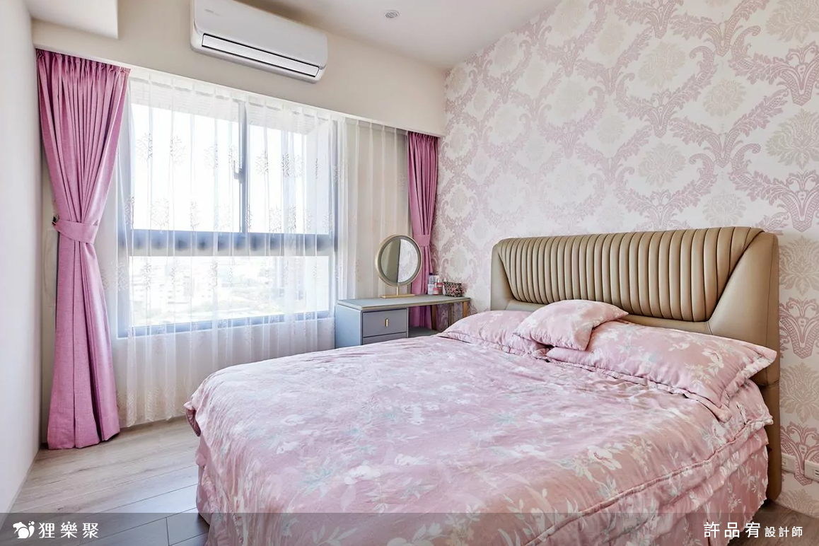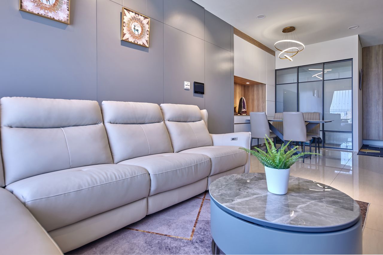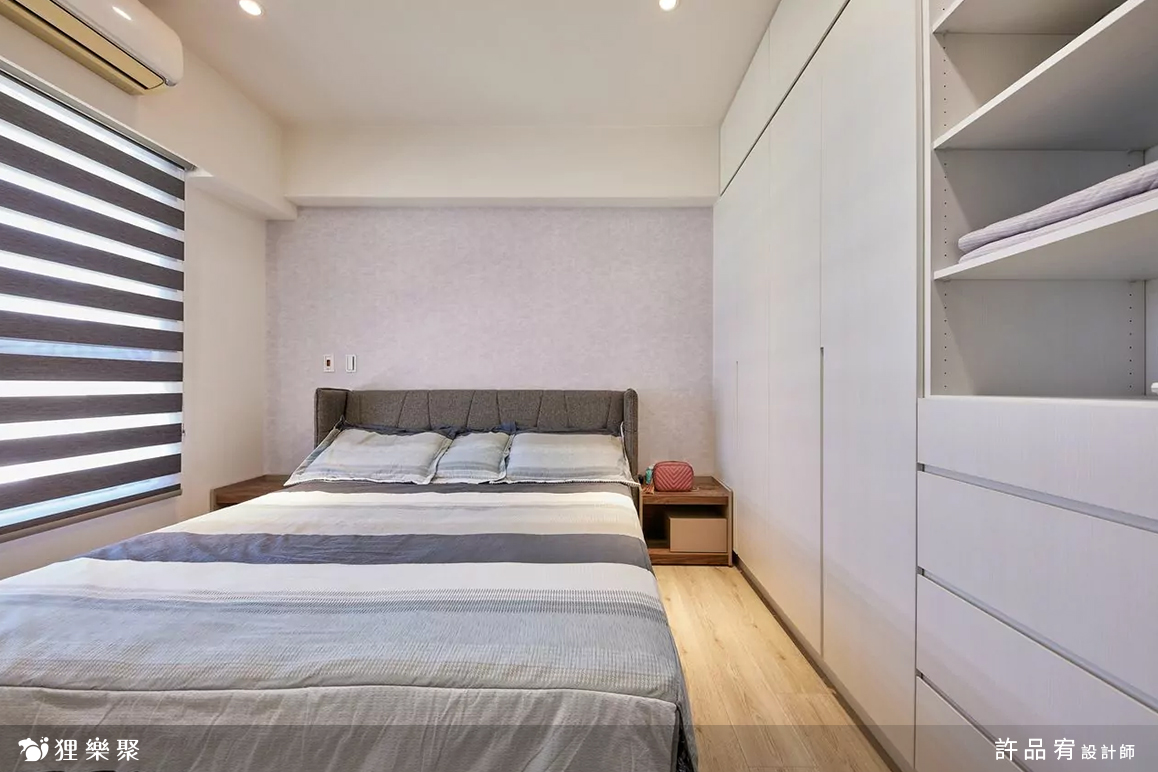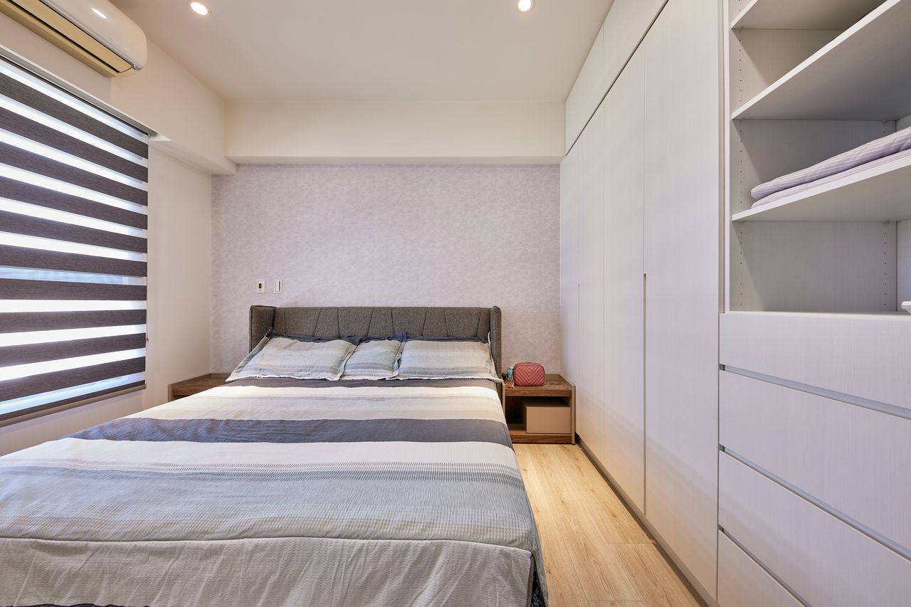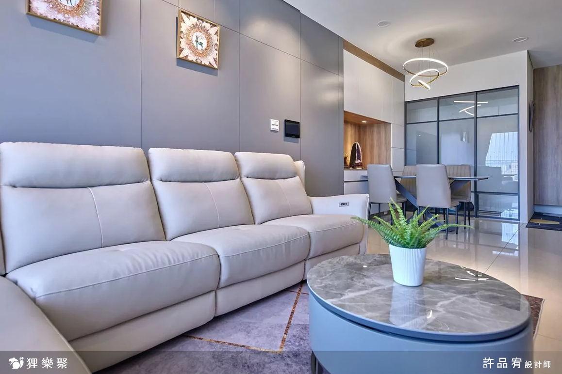 在看到這個現代風裝潢中,每一個空間的主牆都有不同的設計,從客廳開始,電視主牆以淺灰色岩板拼接,既不容易在屋主觀看電視時搶奪視線,卻又為整個現代風客廳設計添加不少個性感,沙發背牆則使用低調的藍灰色牆板,上方安裝了掛畫軌道,讓屋主可以隨時根據心情、需求來更換畫作,主臥室及次臥的床頭主牆面也都選擇了壁紙,立刻呈現出不同房間的獨有個性。