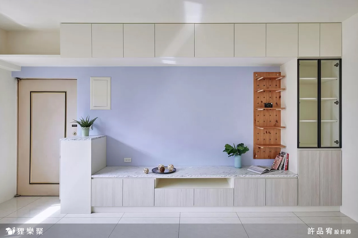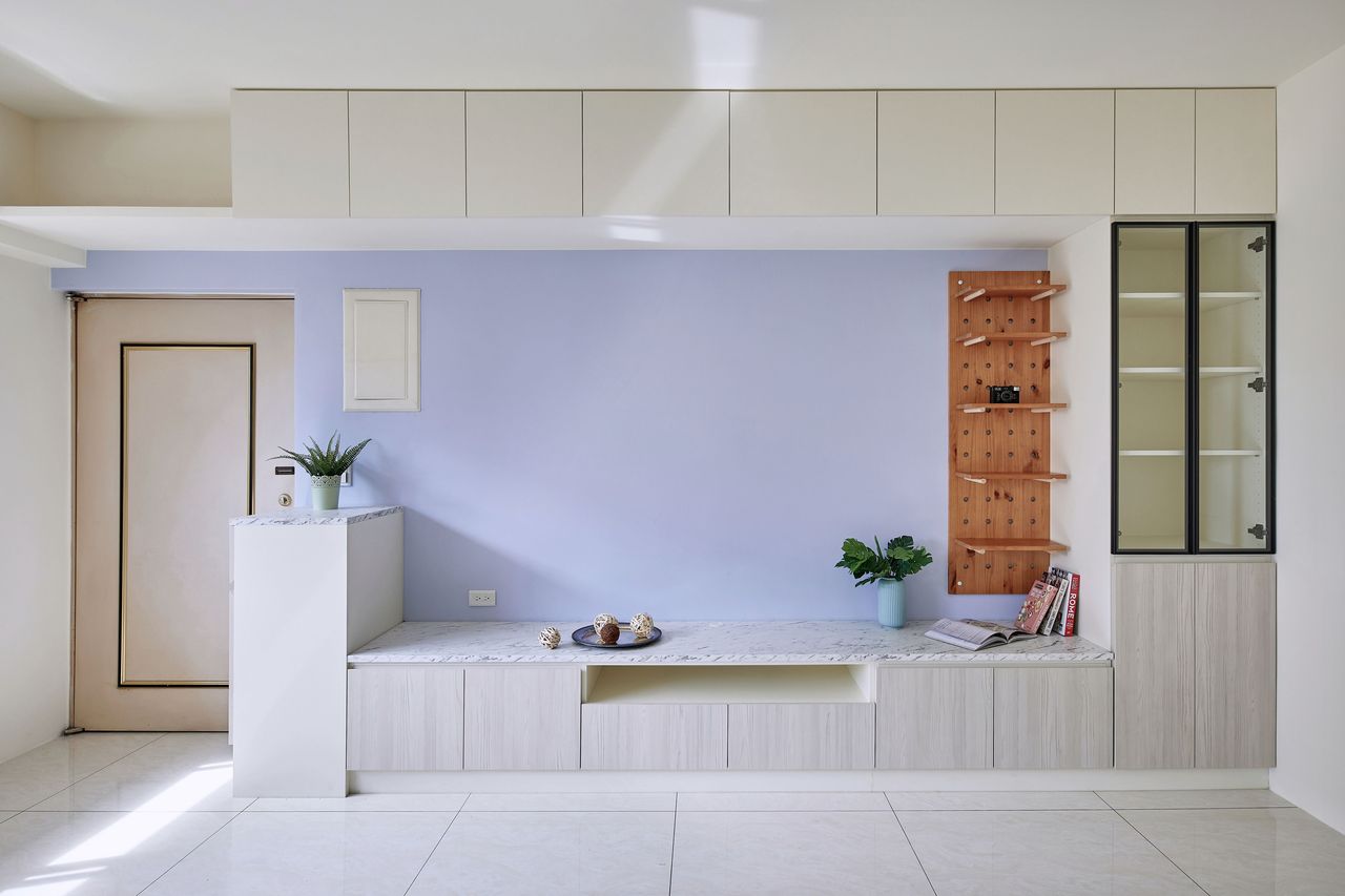 客廳主牆使用了業主最喜愛的藍莓紫做油漆跳色,每天看著這面牆就能輕易地擁有好心情,搭配上方的奶油白收納吊櫃與下方的淺木紋收納矮櫃,就像一塊溫和滑順的藍莓蛋糕。