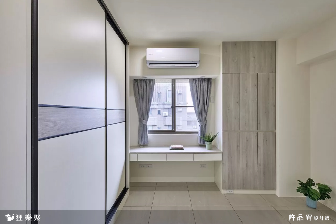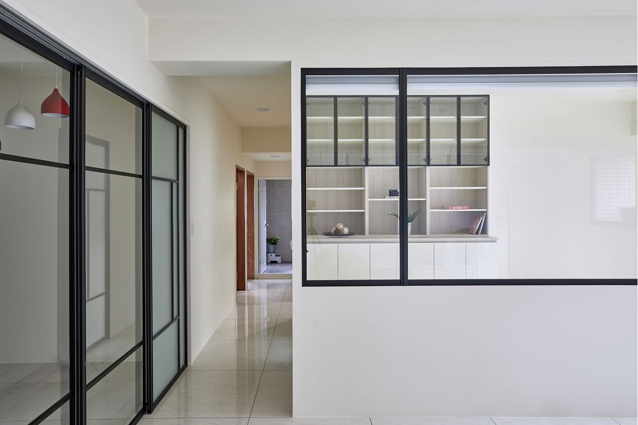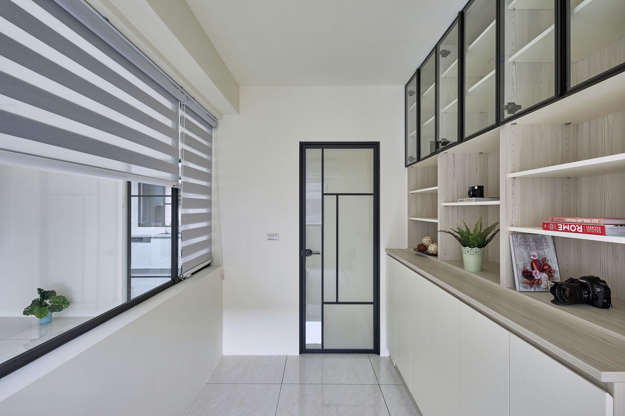 整體的空間風格設計以現代簡約風為方向,利用平直的線條打造俐落的視覺效果,色調則以白色系板材搭配黑色鋁框為主,並輔以溫暖的淺木紋色,增添了不少居家空間的溫馨感。