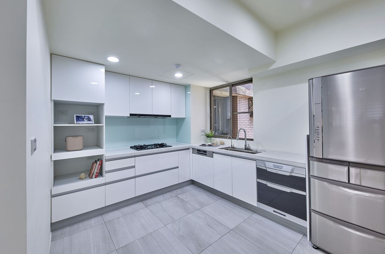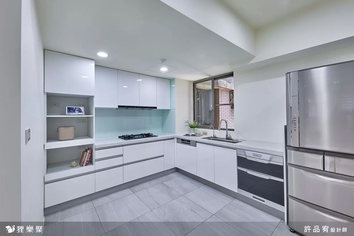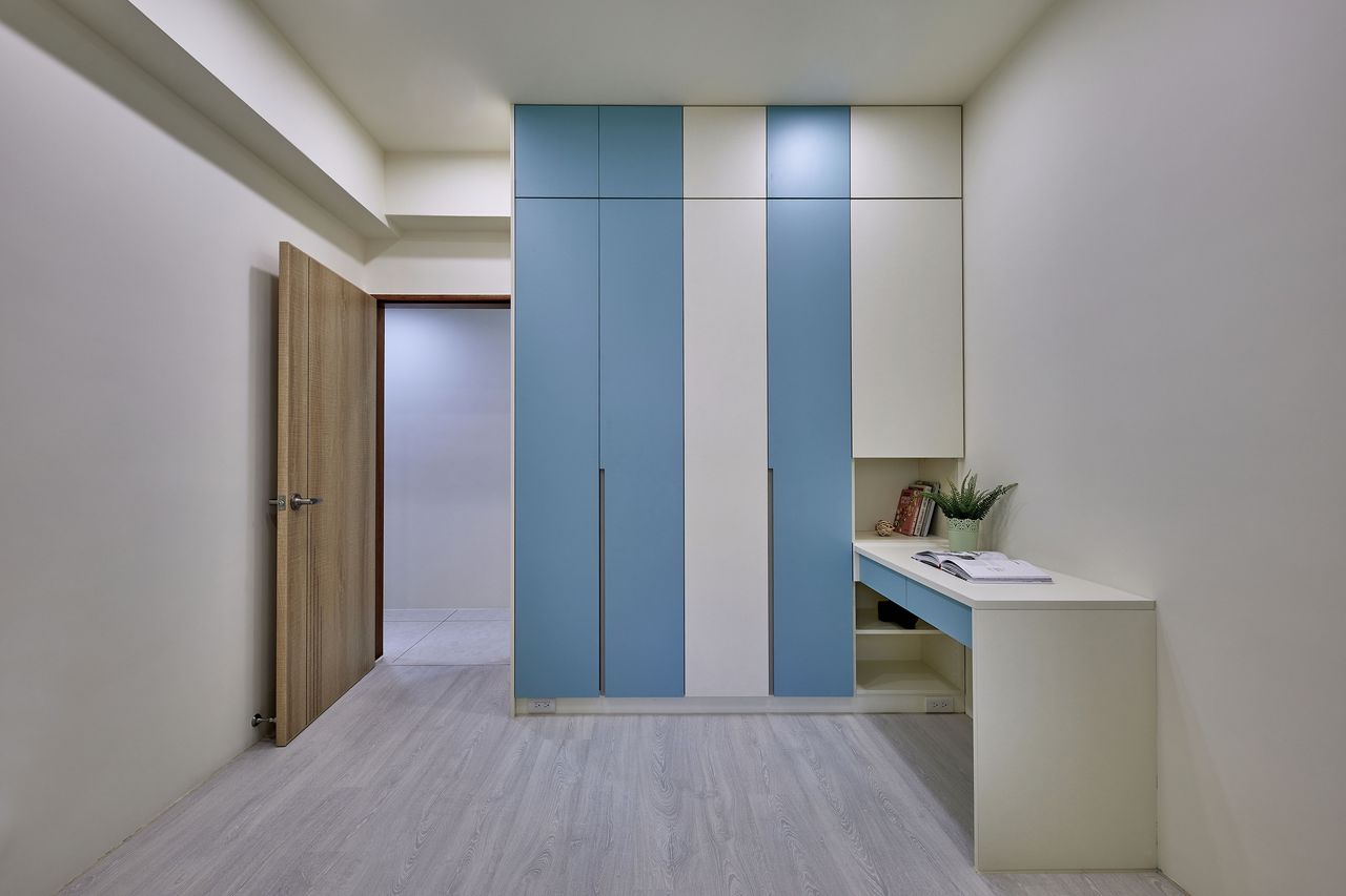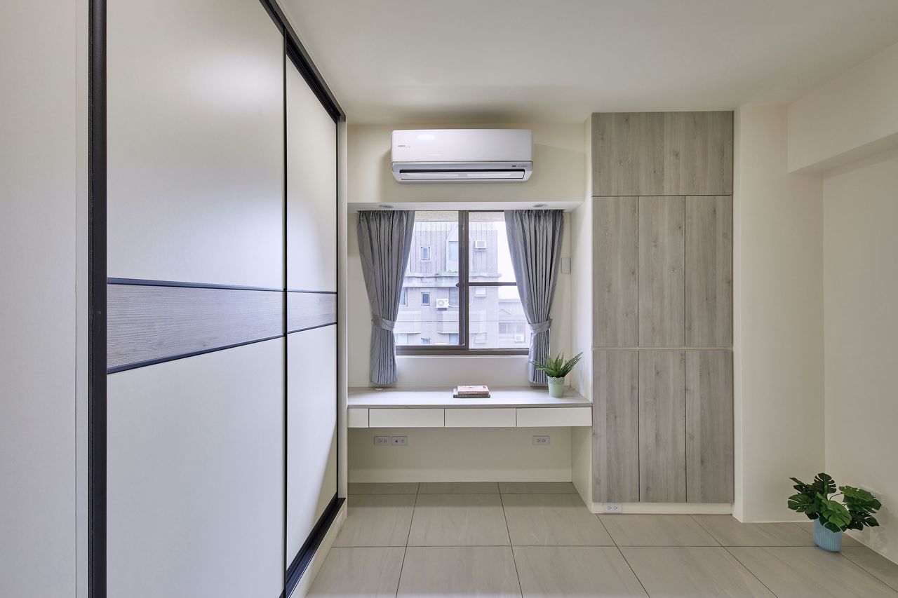 整體的空間風格設計以現代簡約風為方向,利用平直的線條打造俐落的視覺效果,色調則以白色系板材搭配黑色鋁框為主,並輔以溫暖的淺木紋色,增添了不少居家空間的溫馨感。
