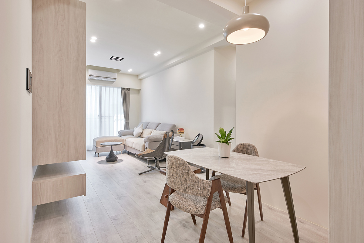 這個新成屋設計的空間規劃內容主要著重在玄關、餐廳與客廳,利用系統收納櫃打造收納之餘,同時藉由櫃體的板材顏色打造清新的簡約北歐風,玄關的鞋櫃和餐廳的餐邊櫃皆選擇了淺色系的木紋,打造清新、乾淨的視覺氛圍。電視牆左側的收納櫃同樣選擇淺色的板材,並利用吊櫃的形式來減輕高櫃帶來的笨重感,下方的收納抽屜則以深淺兩色的木紋拼接,深色的櫃體可以讓空間的視覺重點自動集中在電視牆的範圍,地板鋪上淺色的超耐磨,整個新成屋裝潢的公共空間簡單卻也不失溫馨感。