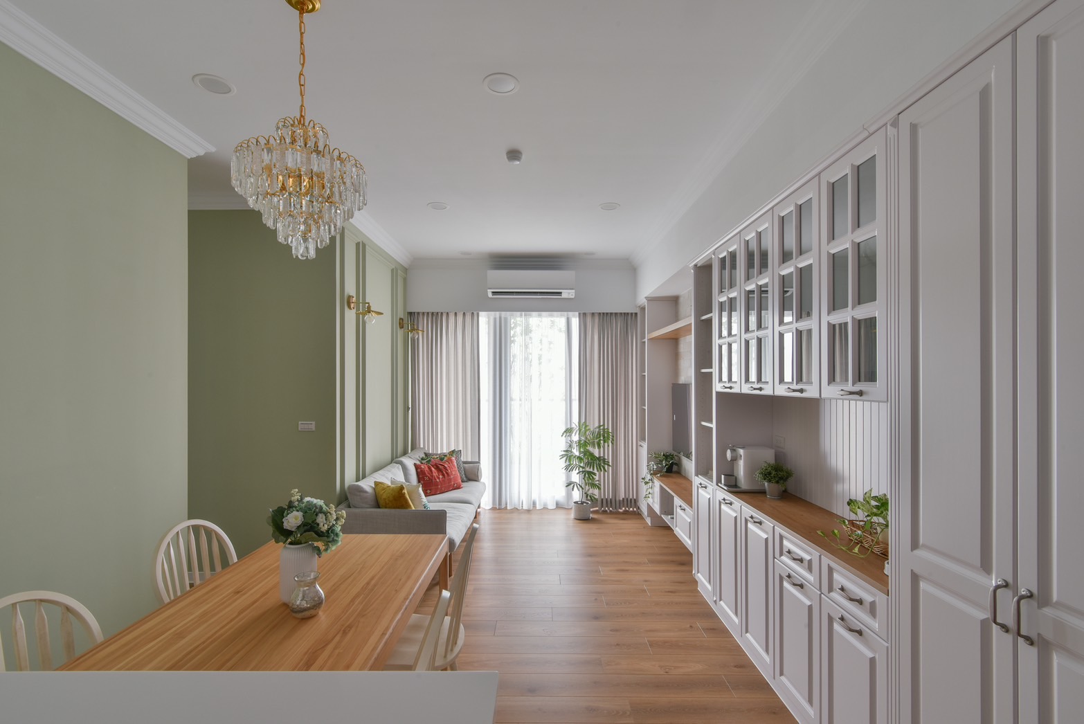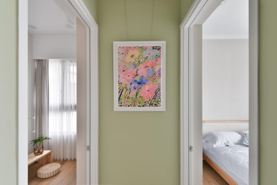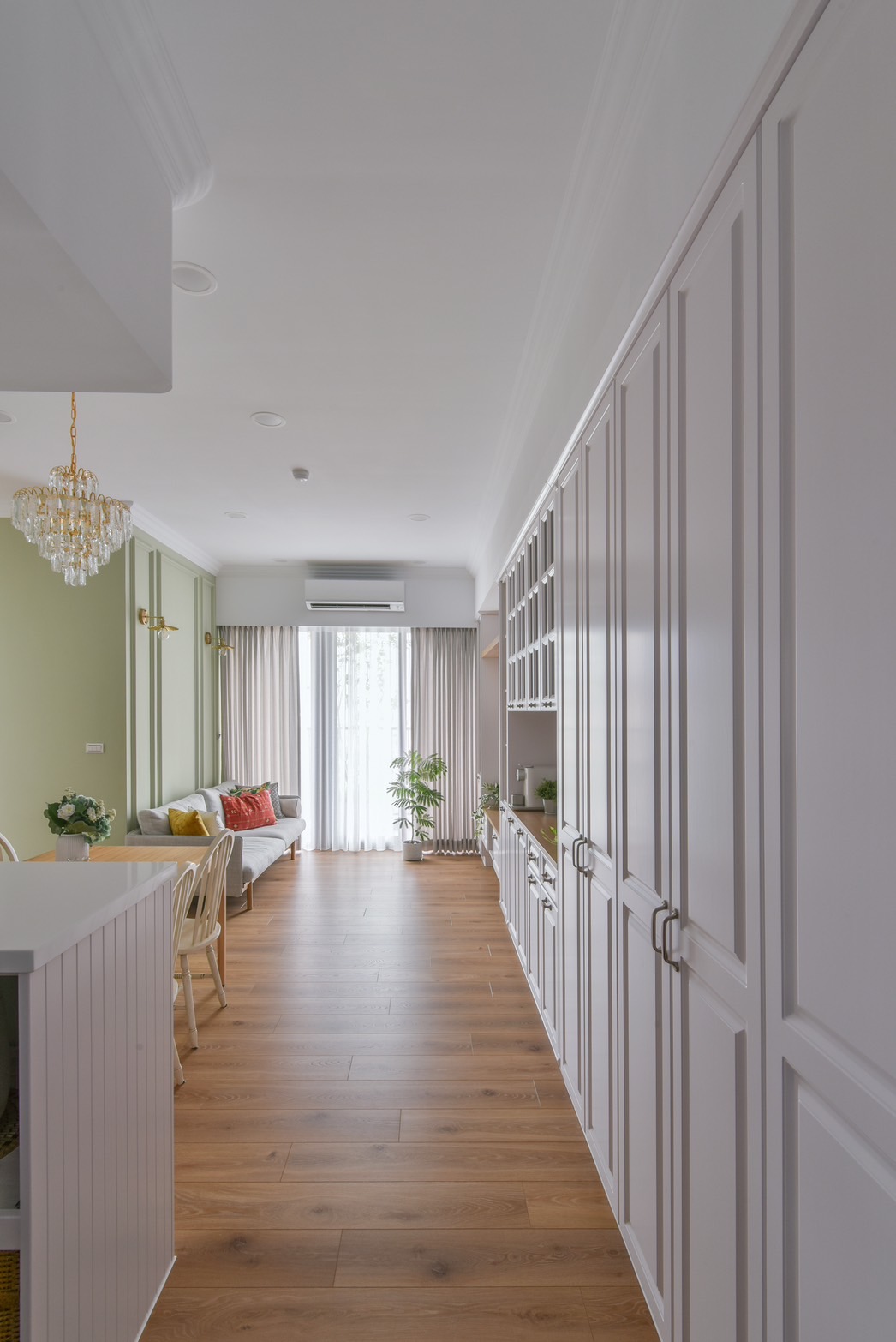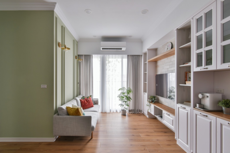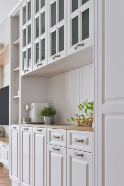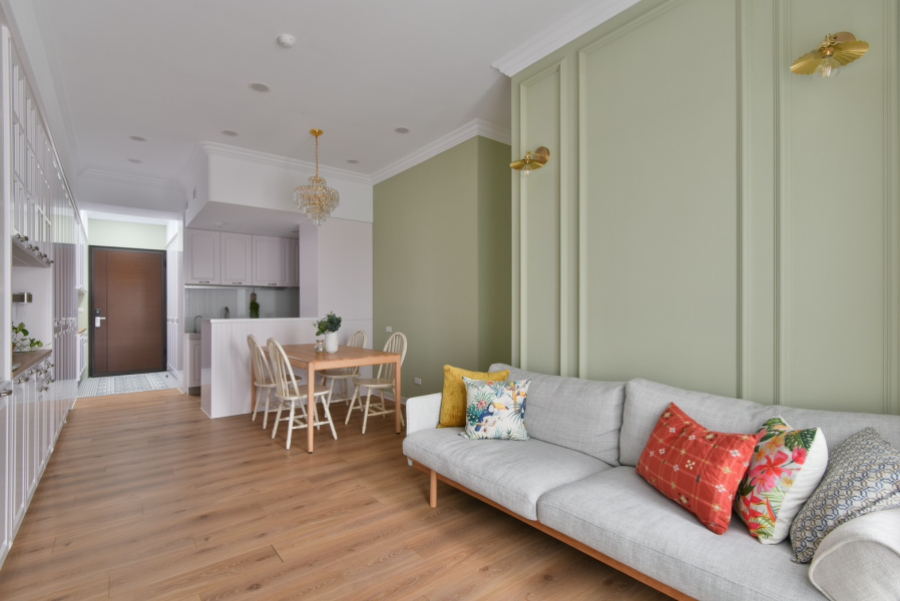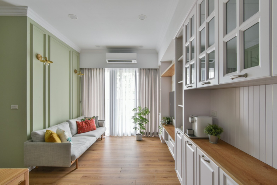 喜愛旅遊的業主,在遍覽歐洲許多美麗的風景之後,決定將最璀璨的記憶搬回家中,本案以古典鄉村風裝潢為主軸,安排中性色的橄欖綠,象徵和平的色調為居家帶注入溫馨恬靜氛圍。一踏進玄關,映入眼簾的是與樑柱切齊的一字型系統櫃設計,透過大面積的收納規劃,賦與生活極致的機能與便利性,門扇也根據鄉村風裝潢安排線板與金屬把手,收納的同時也能做為餐邊櫃使用,在閒暇之餘能沖杯咖啡,享受暢快時光。恬靜鄉村風裝潢小宅