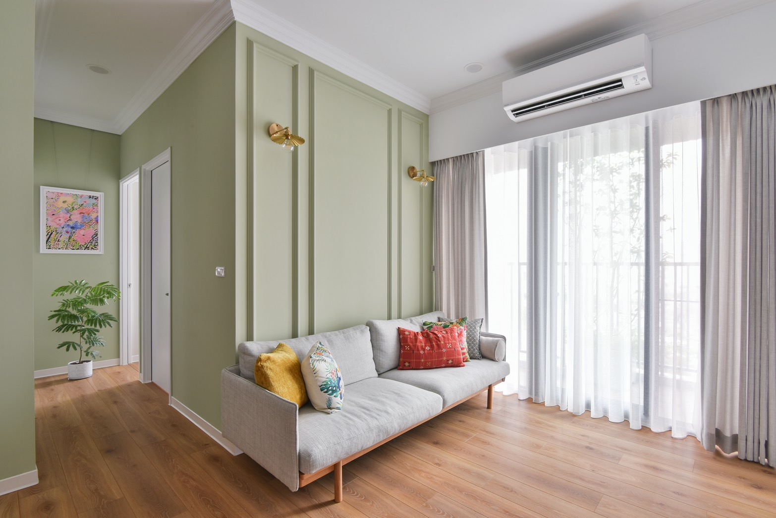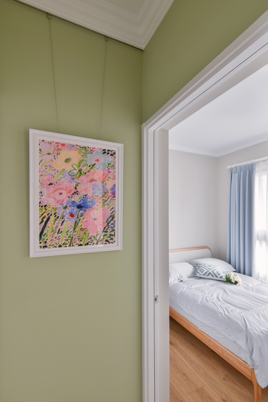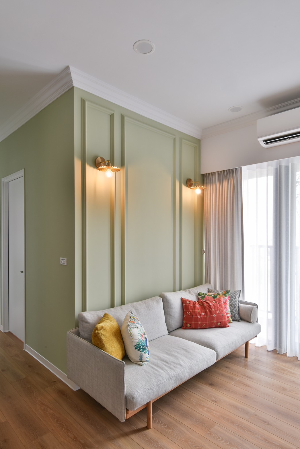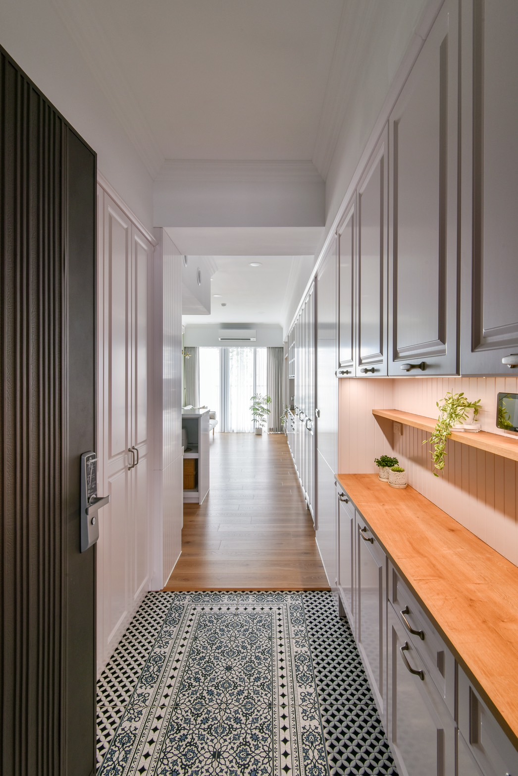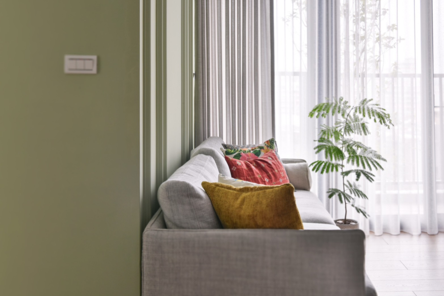喜愛旅遊的業主,在遍覽歐洲許多美麗的風景之後,決定將最璀璨的記憶搬回家中,本案以古典鄉村風裝潢為主軸,安排中性色的橄欖綠,象徵和平的色調為居家帶注入溫馨恬靜氛圍。一踏進玄關,映入眼簾的是與樑柱切齊的一字型系統櫃設計,透過大面積的收納規劃,賦與生活極致的機能與便利性,門扇也根據鄉村風裝潢安排線板與金屬把手,收納的同時也能做為餐邊櫃使用,在閒暇之餘能沖杯咖啡,享受暢快時光。恬靜鄉村風裝潢小宅