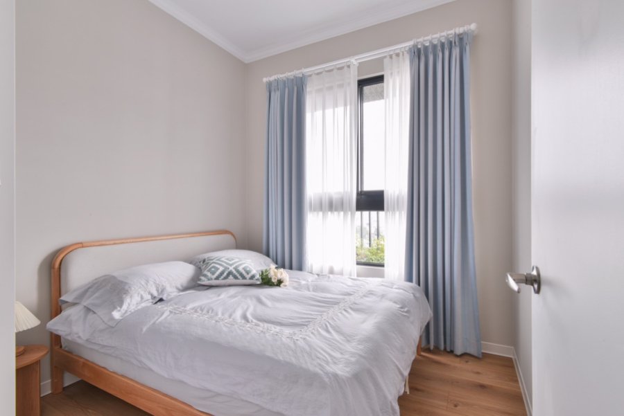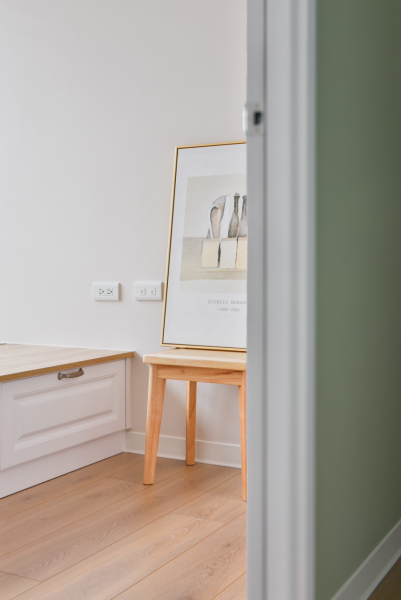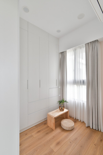 私領域中則是回歸自然調性,主臥透過一襲溫柔的蛋殼色作為視覺焦點,恰好與親膚柔軟的棉被融合,散發鄉村風裝潢的溫暖氣息。為了讓床鋪保有雙走道空間,在收納設計與主浴門片部分選用了滑門規劃,使門扇開闔的面積縮到最小,以創造最高坪效。其餘隔間則以系統櫃設計規劃儲物等多元用途,設計師以架高的臥榻搭配線板元素,將歐式鄉村風裝潢氛圍融入其中,讓屋主能自在的享受陽光,搭配底部的收納設計,不僅能儲藏生活備品,在親友來訪時也能作為客臥使用,兼具美感與滿滿的機能性。