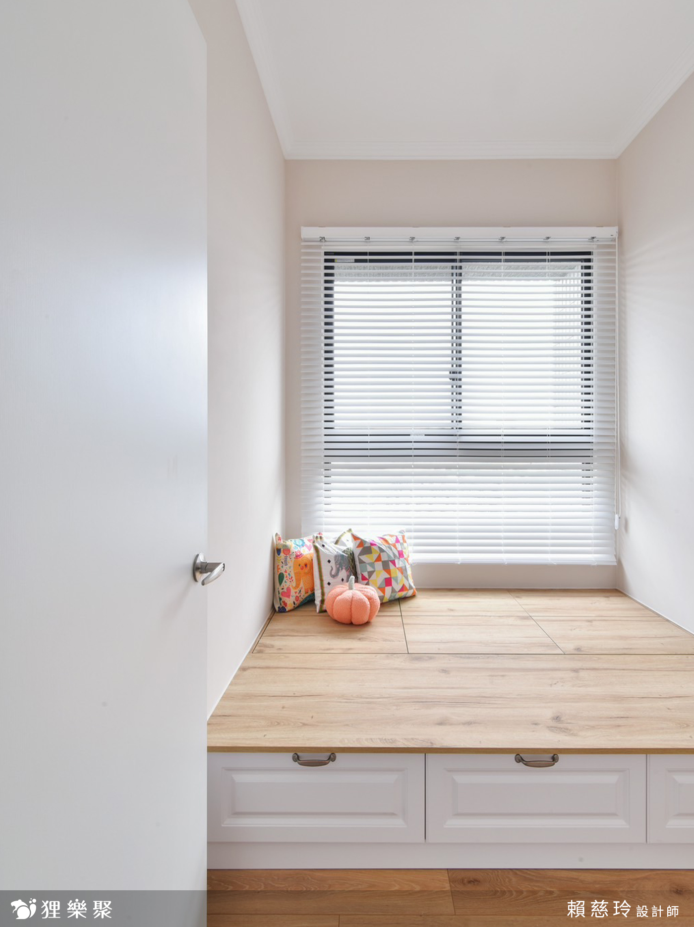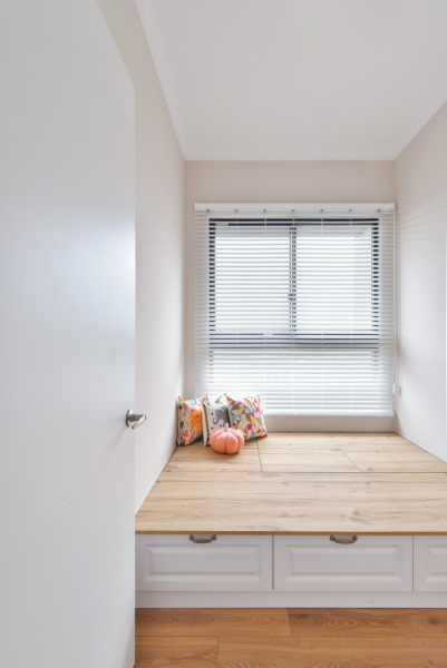 其餘隔間則以系統櫃設計規劃儲物等多元用途,設計師以架高的臥榻搭配線板元素,將歐式鄉村風裝潢氛圍融入其中,讓屋主能自在的享受陽光,搭配底部的收納設計,不僅能儲藏生活備品,在親友來訪時也能作為客臥使用,兼具美感與滿滿的機能性。