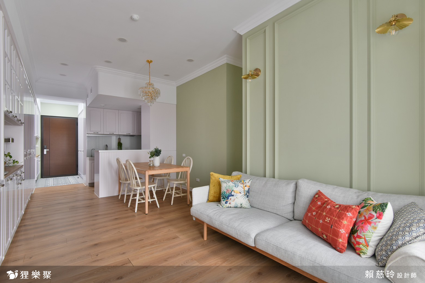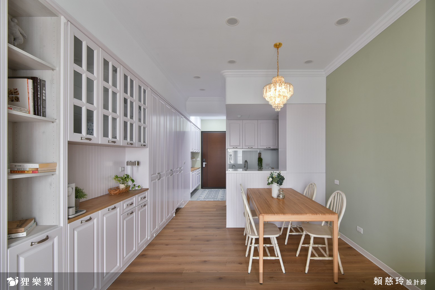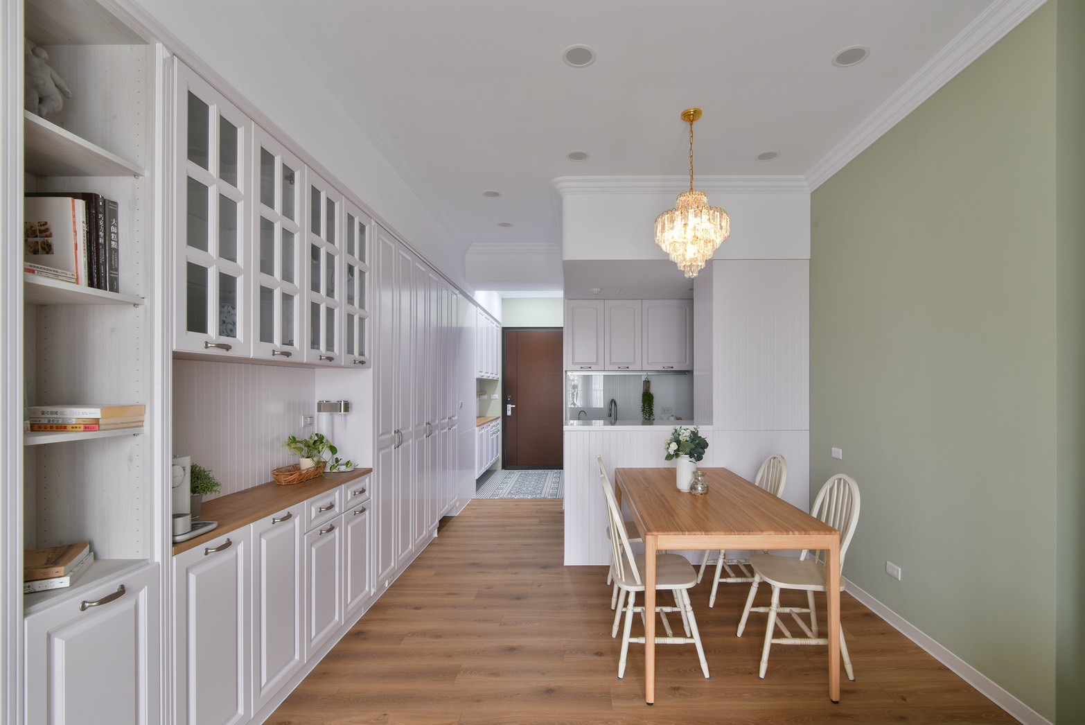 打開大門,玄關區優美的花磚鋪陳,搭配些微的高低差設計,能做為室內外的緩衝空間,方便屋主返家後在此換鞋,同時讓戶外的沙塵、髒汙停留於此。餐廳一側以整面的線板搭配系統櫃設計,不僅能作為餐邊櫃使用,也滿足屋主的大量儲物需求,另一側以橄欖綠牆面襯上精緻的水晶燈具,為樸素淡雅的空間增添獨特的風格與魅力,創造素雅恬淡的鄉村風裝潢氛圍。