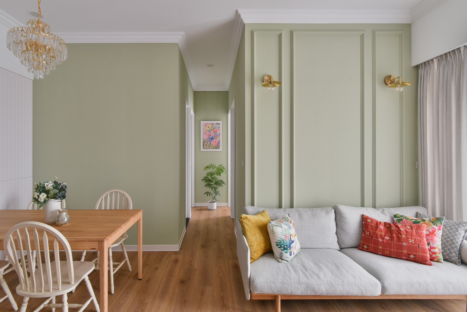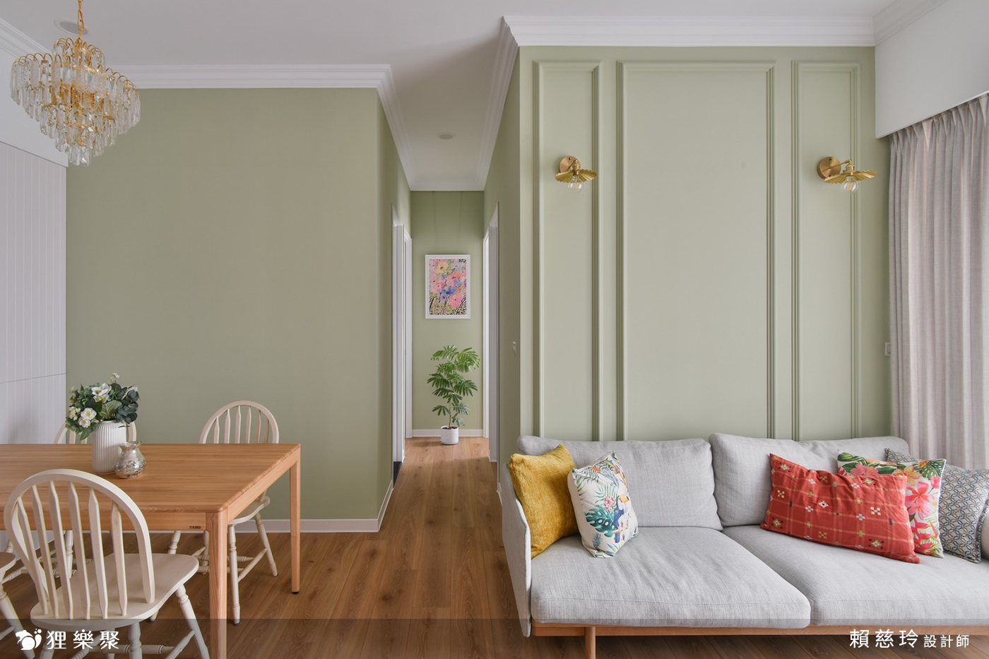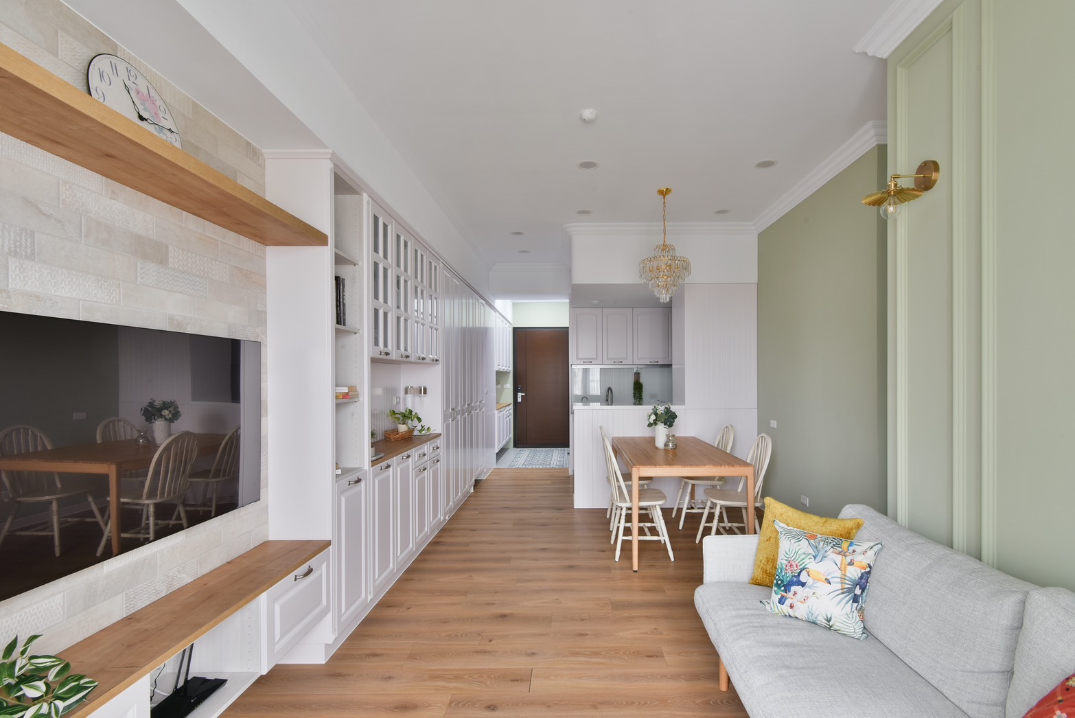 打開大門,玄關區優美的花磚鋪陳,搭配些微的高低差設計,能做為室內外的緩衝空間,方便屋主返家後在此換鞋,同時讓戶外的沙塵、髒汙停留於此。餐廳一側以整面的線板搭配系統櫃設計,不僅能作為餐邊櫃使用,也滿足屋主的大量儲物需求,另一側以橄欖綠牆面襯上精緻的水晶燈具,為樸素淡雅的空間增添獨特的風格與魅力,創造素雅恬淡的鄉村風裝潢氛圍。
