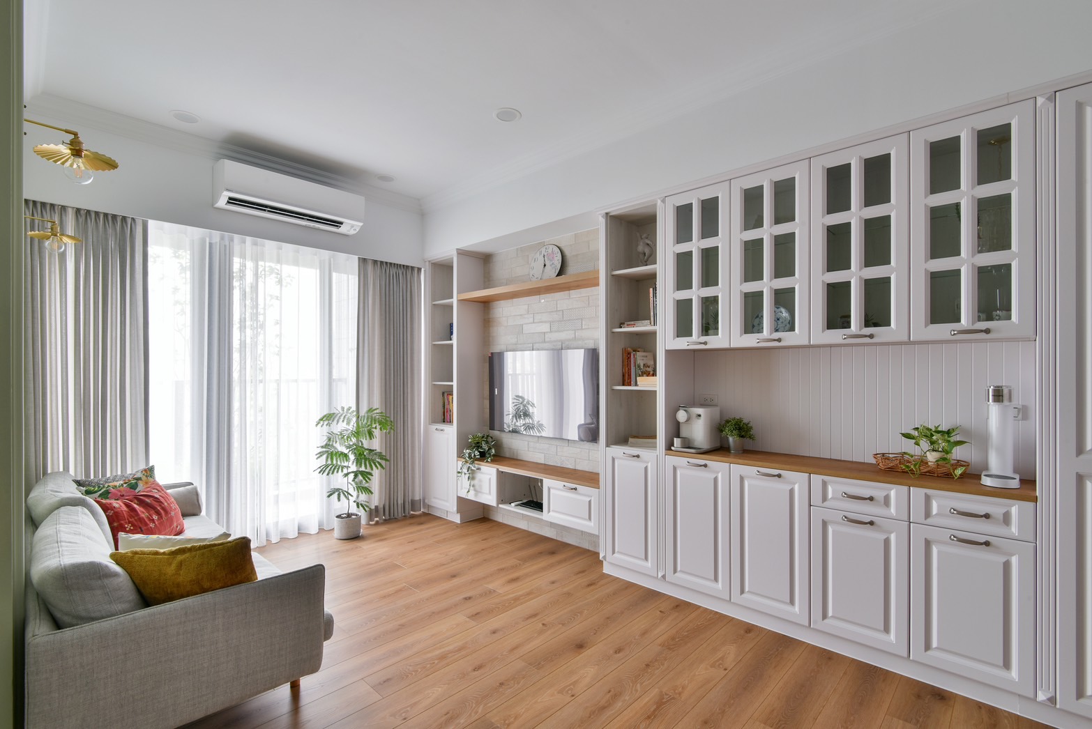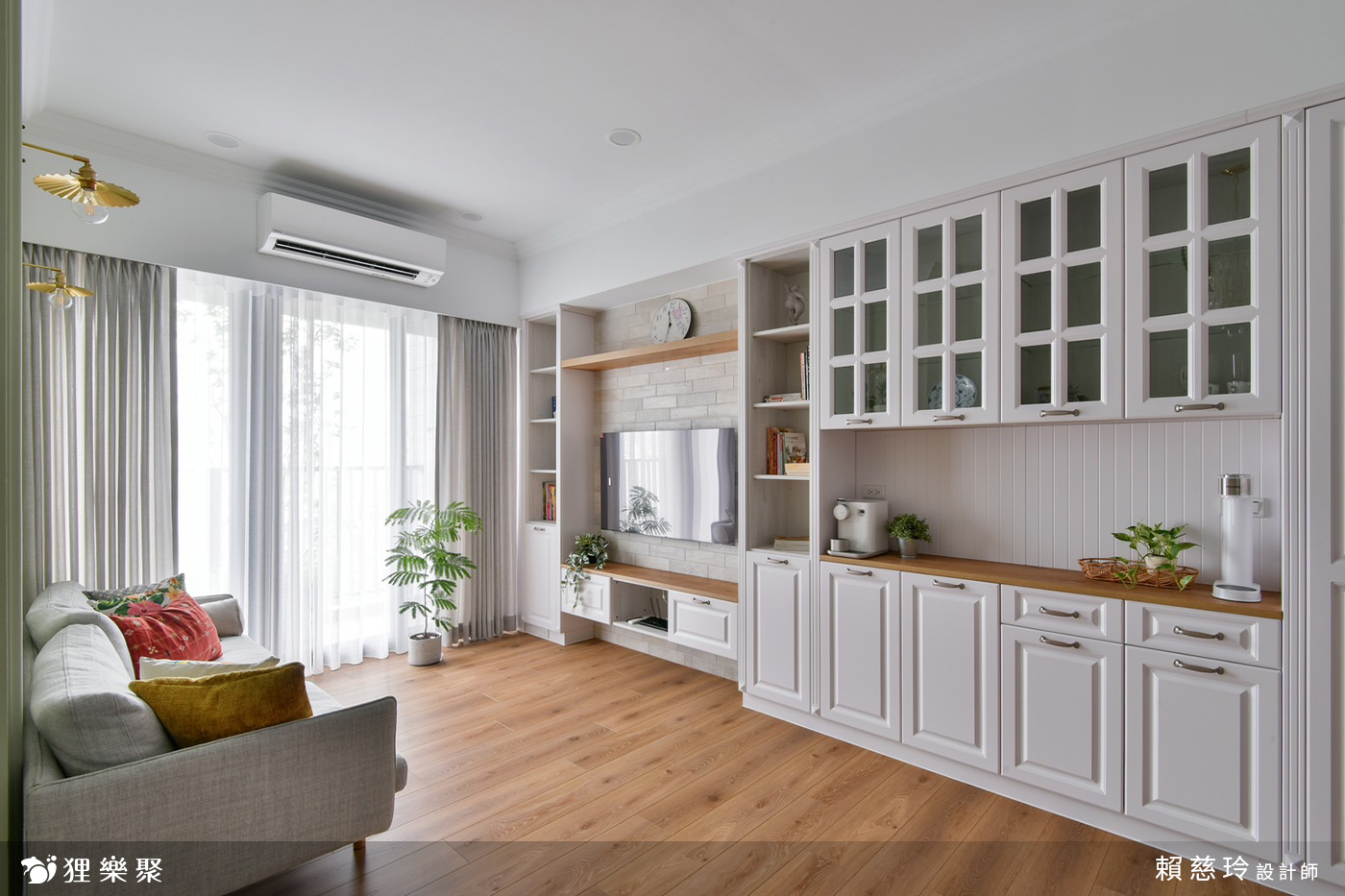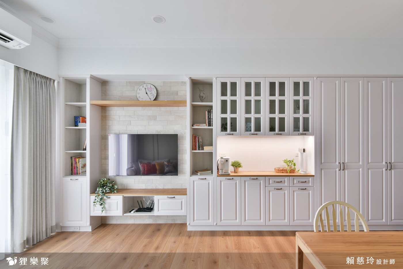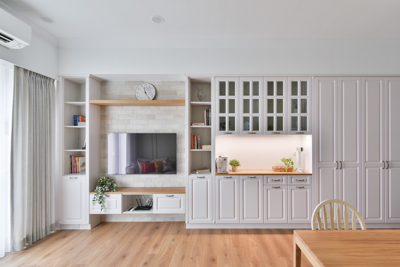 走進客廳,沙發背牆的對稱線板、銜接天地的裝飾線,為空間帶來優雅的韻律與節奏,襯上溫暖的超耐磨木地板、歐風的電視牆與系統櫃設計,簡單的鄉村風裝潢就能為居家創造無比的舒適放鬆感受。