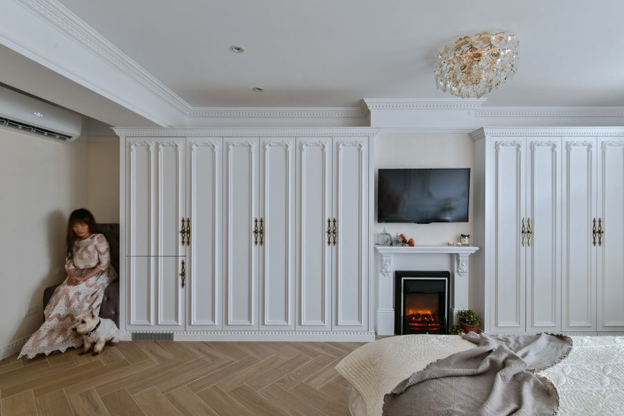 全室使用白色為底色,如線板、櫥櫃、家具等等皆是選用白色,讓空間能在華麗的裝飾下不顯浮誇;再以金色做為點綴,壁燈、水龍頭