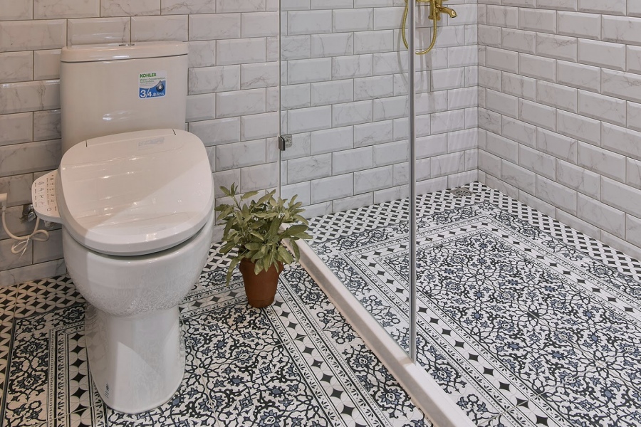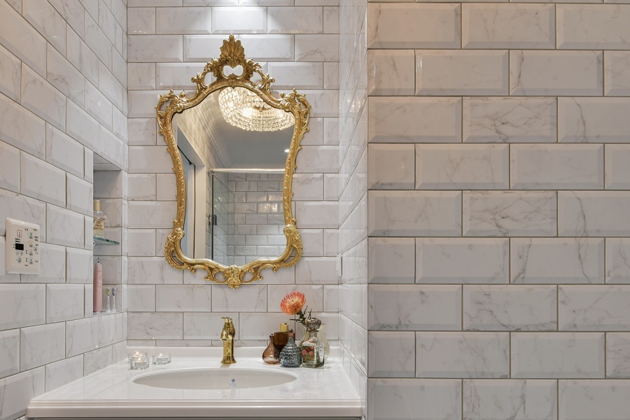 廁所的地板鋪上紋路較複雜的復古花磚,金色的蓮蓬頭和水龍頭呼應房間內的金色零件,並且掛上有著華麗浮雕的金框大鏡子,和冷色