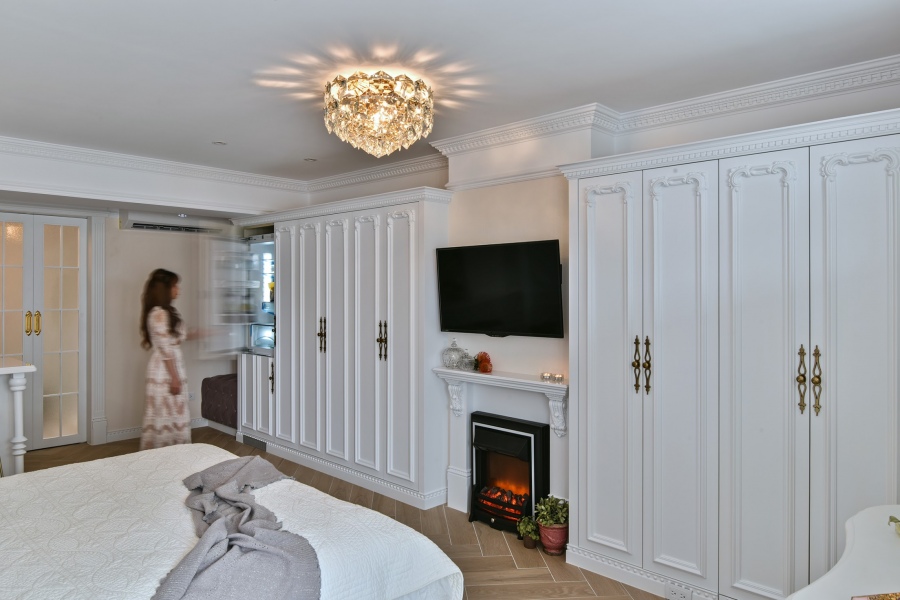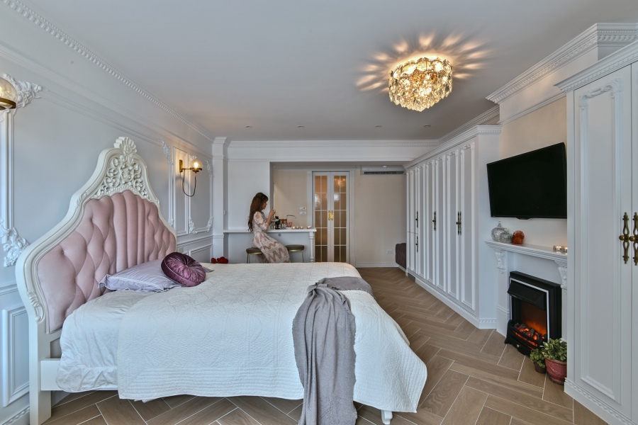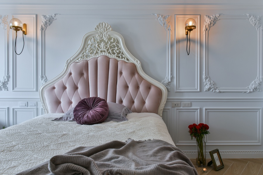 在床頭背牆、天花板的邊緣和櫥櫃的設計上皆使用了大量複雜的浮雕及線板來做裝飾,並且在配置上重視中軸線及兩側的對稱性,以展