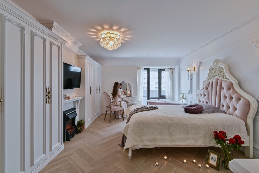 水晶吊燈是法式古典風必不可少的重點元素,將其做為整個空間的主燈,再輔以壁燈,盡量減少其他的照明方式,僅在長形房間的兩側