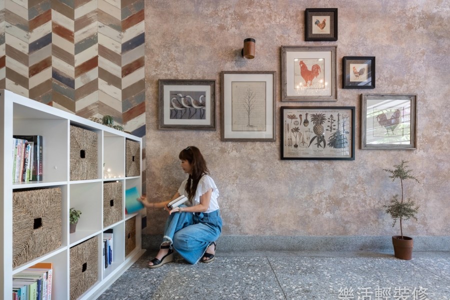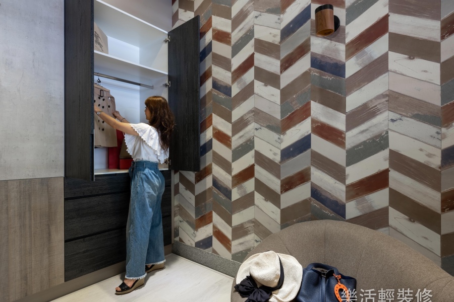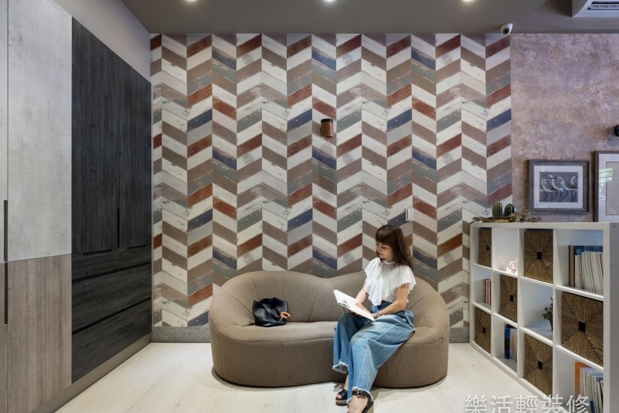 展現風格的一大利器,原始的仿水泥粉光壁紙烘托出工業風的氣息,具有斑駁感的人字色塊則拼接出鄉村風的味道,簡單的壁紙運用其