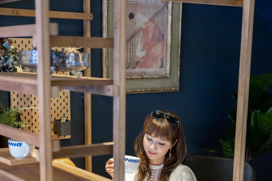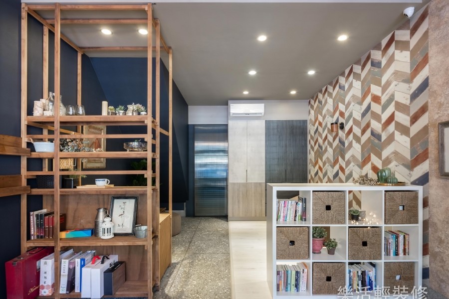 家具靈活地區隔空間,視覺上仍能保有流通性,而與櫃檯連為一體的開放層架選擇無背板的設計,同樣能達到減少視覺阻隔的效果。