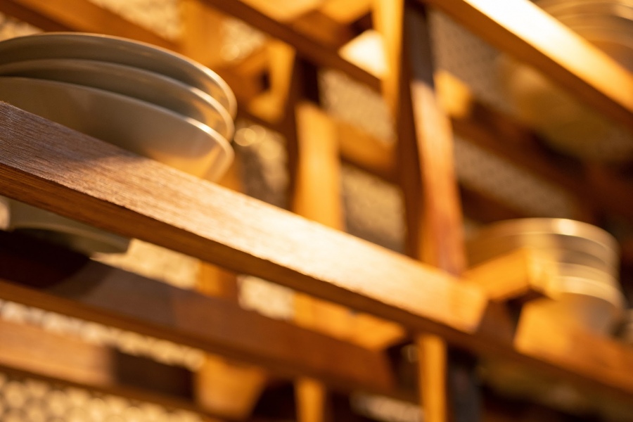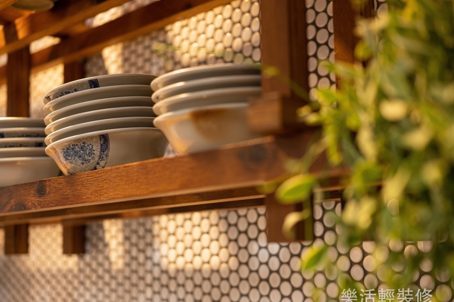 樓梯下的吧台用餐區,先拆除擺放雜物的紊亂隔間門牆後,以碳化角材堆砌出溫潤的木作結構,擺上復古的碗碟,將樓梯下的壓迫感修飾於無形,反之變身為熱門的拍照打卡處。