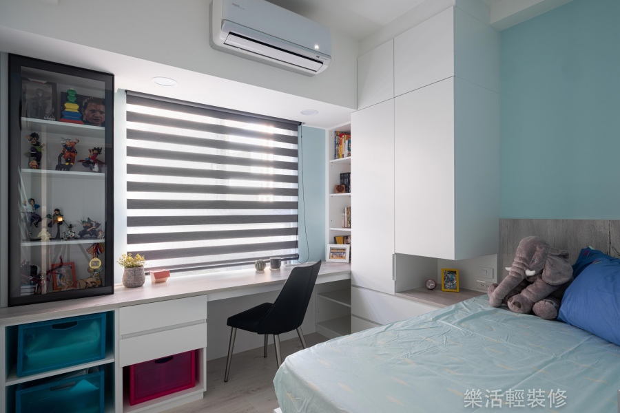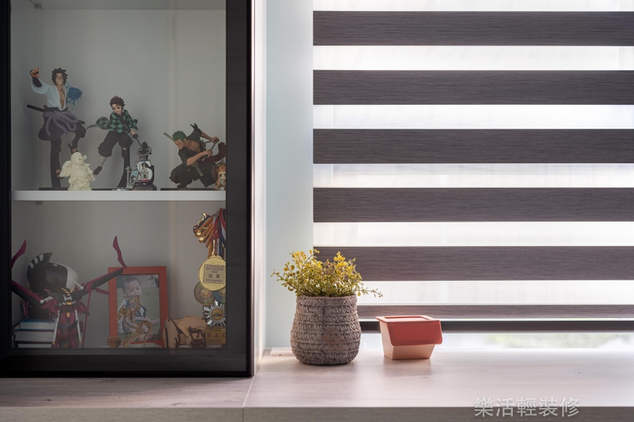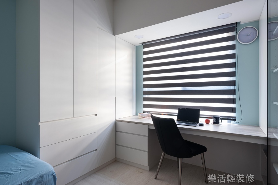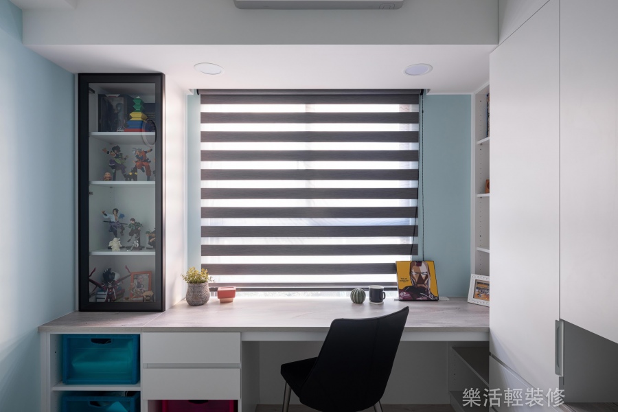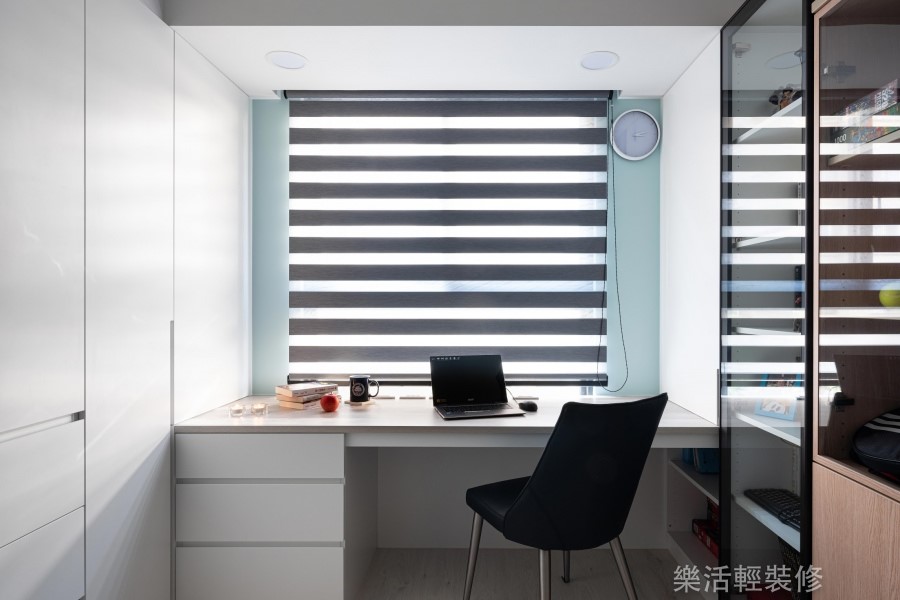 例如此案窗邊的系統櫃深度與樑同深,讓樑和櫃身融為一體,能讓空間線條顯得更加乾淨俐落。