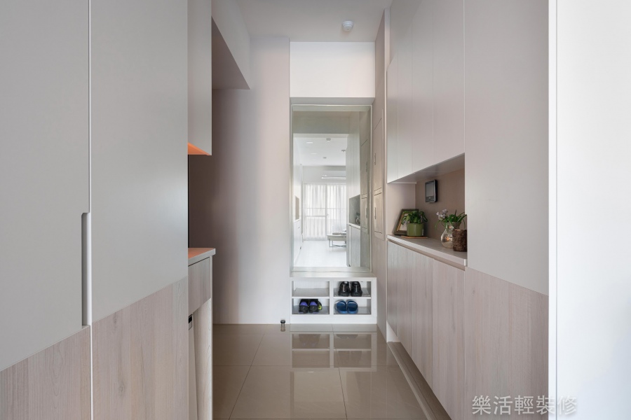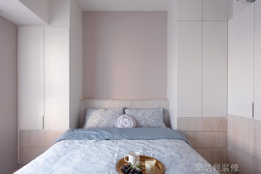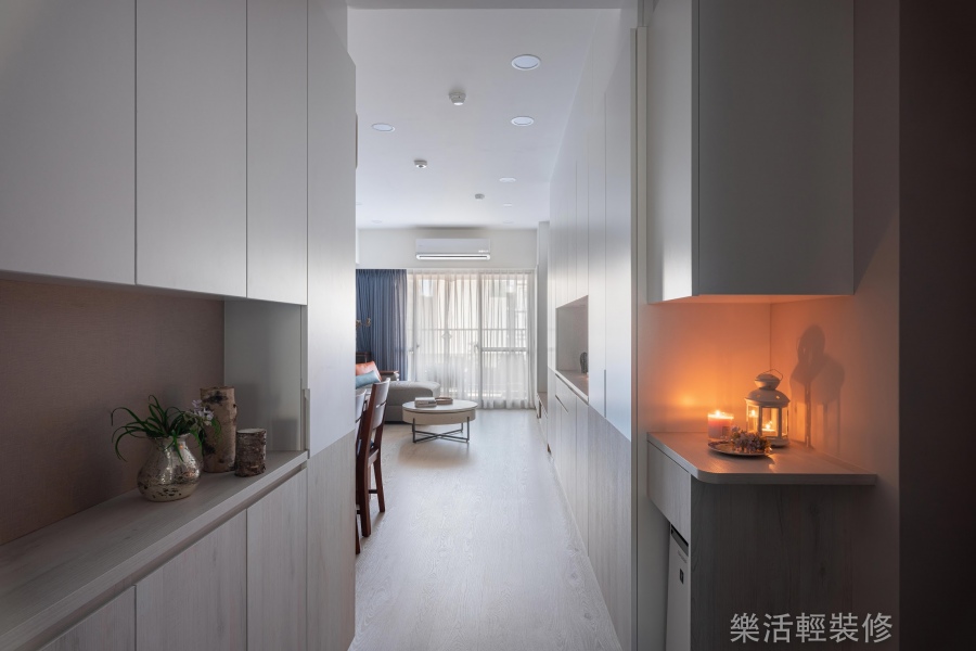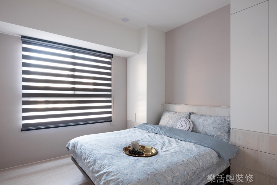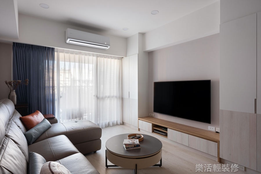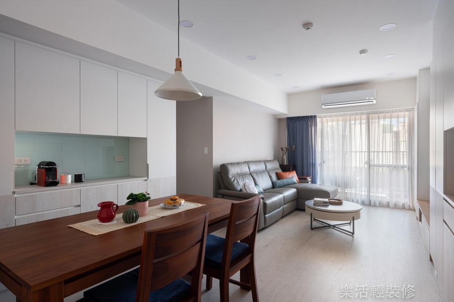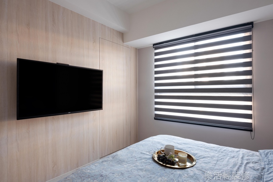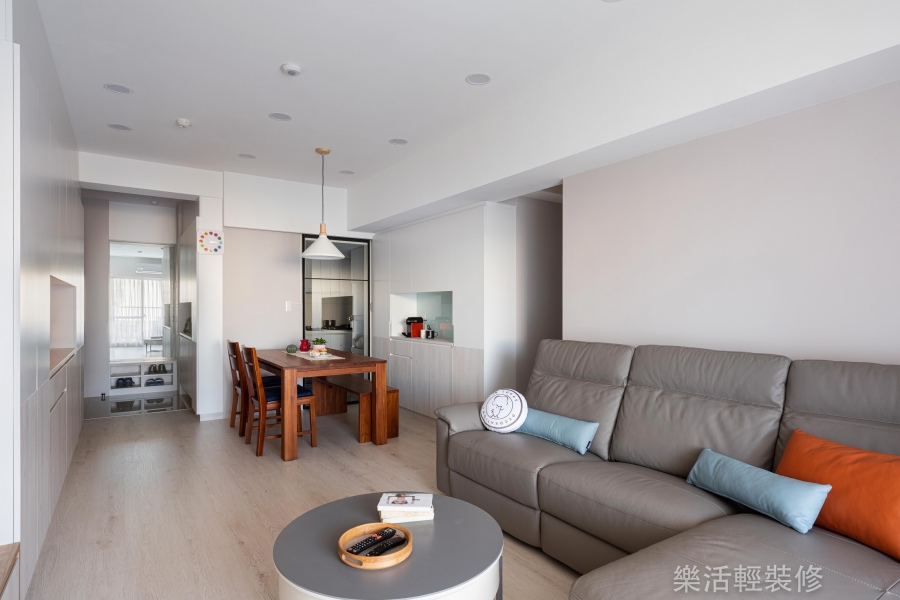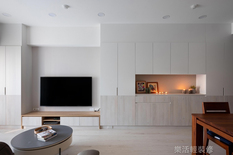 北歐風的留白藝術亦是一大重點,無論是電視主牆、沙發背牆都特意留白不做設計,只用簡單的跳色做變化;而和門片也大量使用白色板材,白色能夠放大空間感,讓小坪數的客餐廳和臥室都不顯得擁擠。