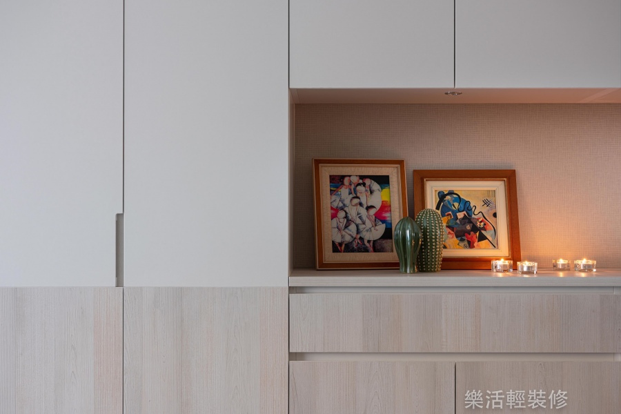 木紋是北歐風格的重要元素,在系統櫃的門片上以白色和木紋色做拼接,簡約卻不無聊,地板也選用同色調的木紋,讓空間有種統一感,帶出乾淨溫暖的氣息。