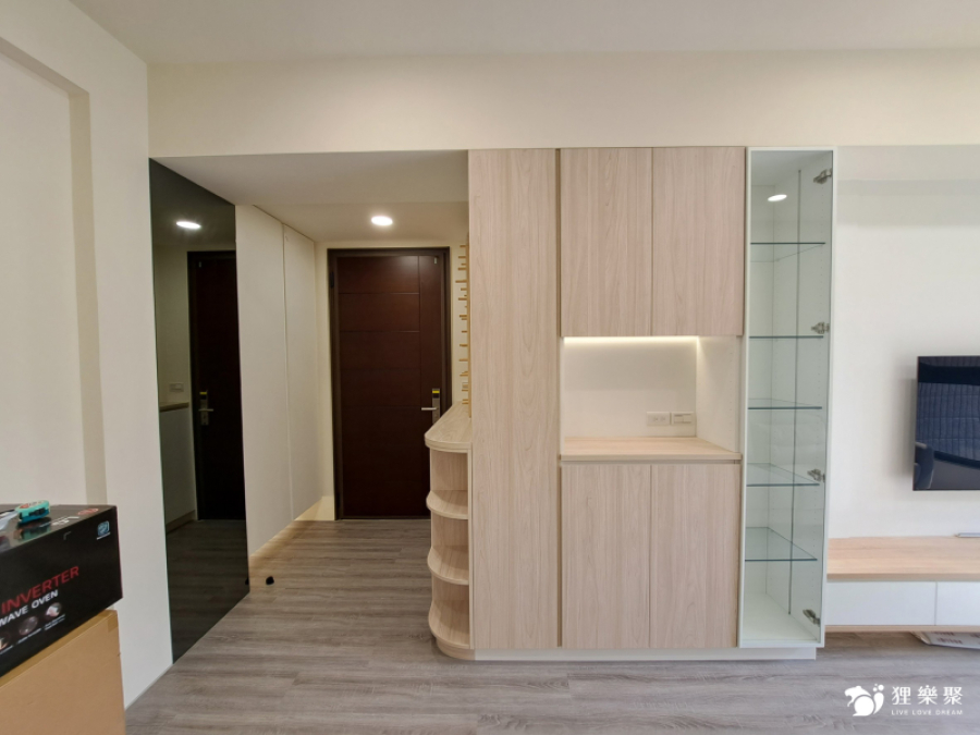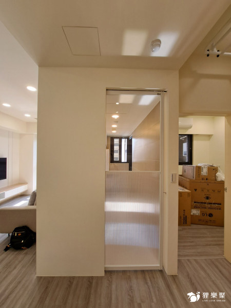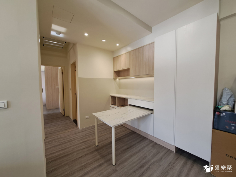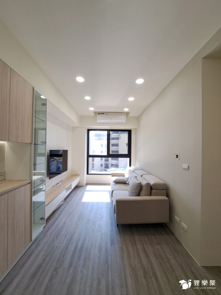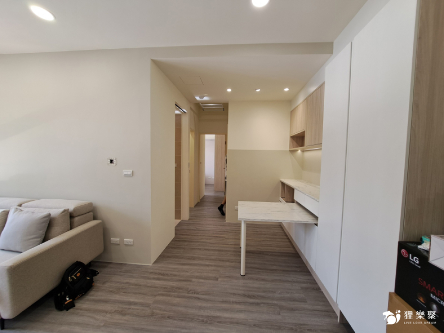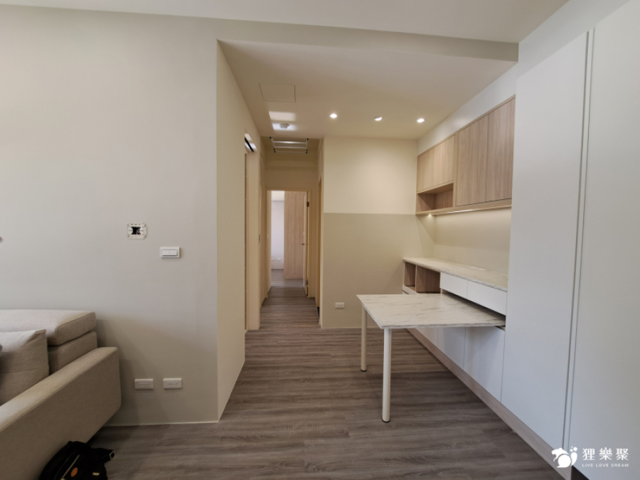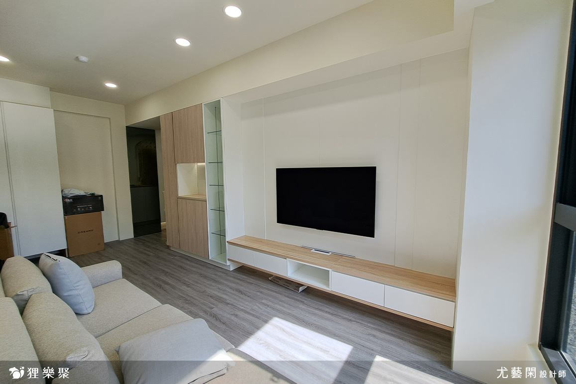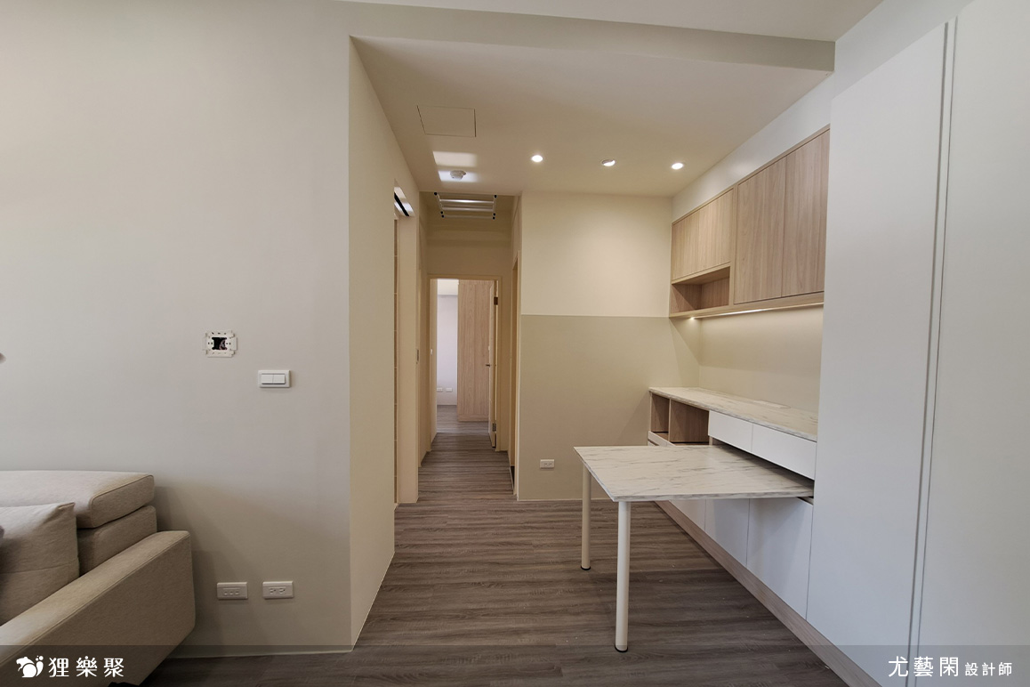 屋主喜歡時下流行的奶油風色系,期望能有舒適且放鬆的生活空間,為扭轉原建商格局尺度較狹小的缺點,設計師透過淺木紋與白色櫃體門片搭配,並在局部牆面刷上奶油色油漆,使整體風格融合一致,打造放鬆且溫暖的居家氛圍。恬適溫暖小宅